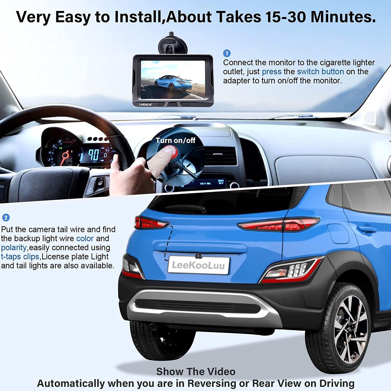 【Installation is easy:】Connect the vehicle backup cameras to a reverse light for backing up, or a key-on or switched power source for for continuous use. connecting the camera to reverse lights for reverse use only.The monitor can be connected to power from the cigarette lighter or fuse panel.