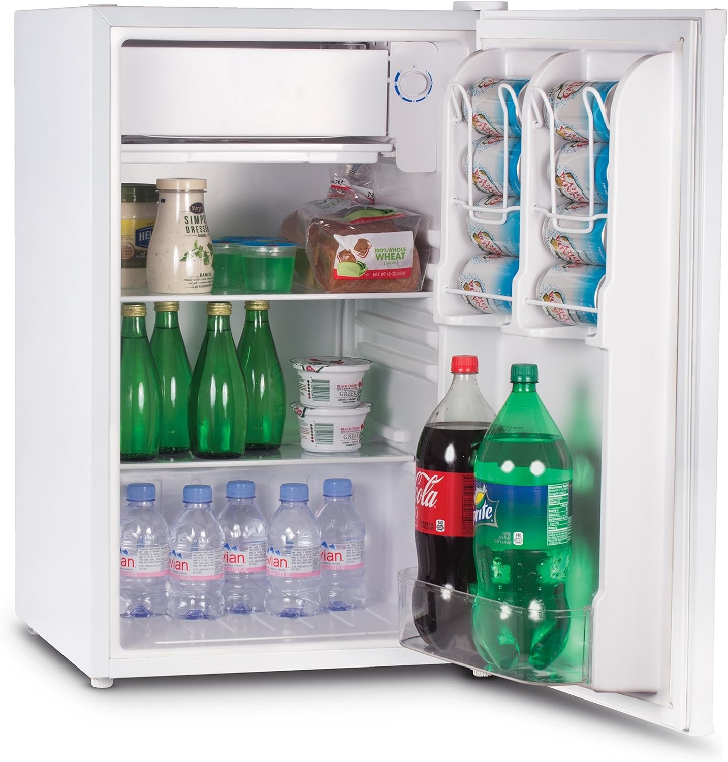 2 Full-width Slide-out Adjustable Glass Shelves 1 Full-width Door Storage Shelves Dual Can Storage Fits up to 8 cans Gallon and 2 Liter Door Storage Full-width Freezer Compartment with Ice Cube Tray Recessed Door Handle, space saving flat back design Adjustable Leveling Legs, Manual Defrost Compliant to DOE 2014 Standards, R600a Refrigerant