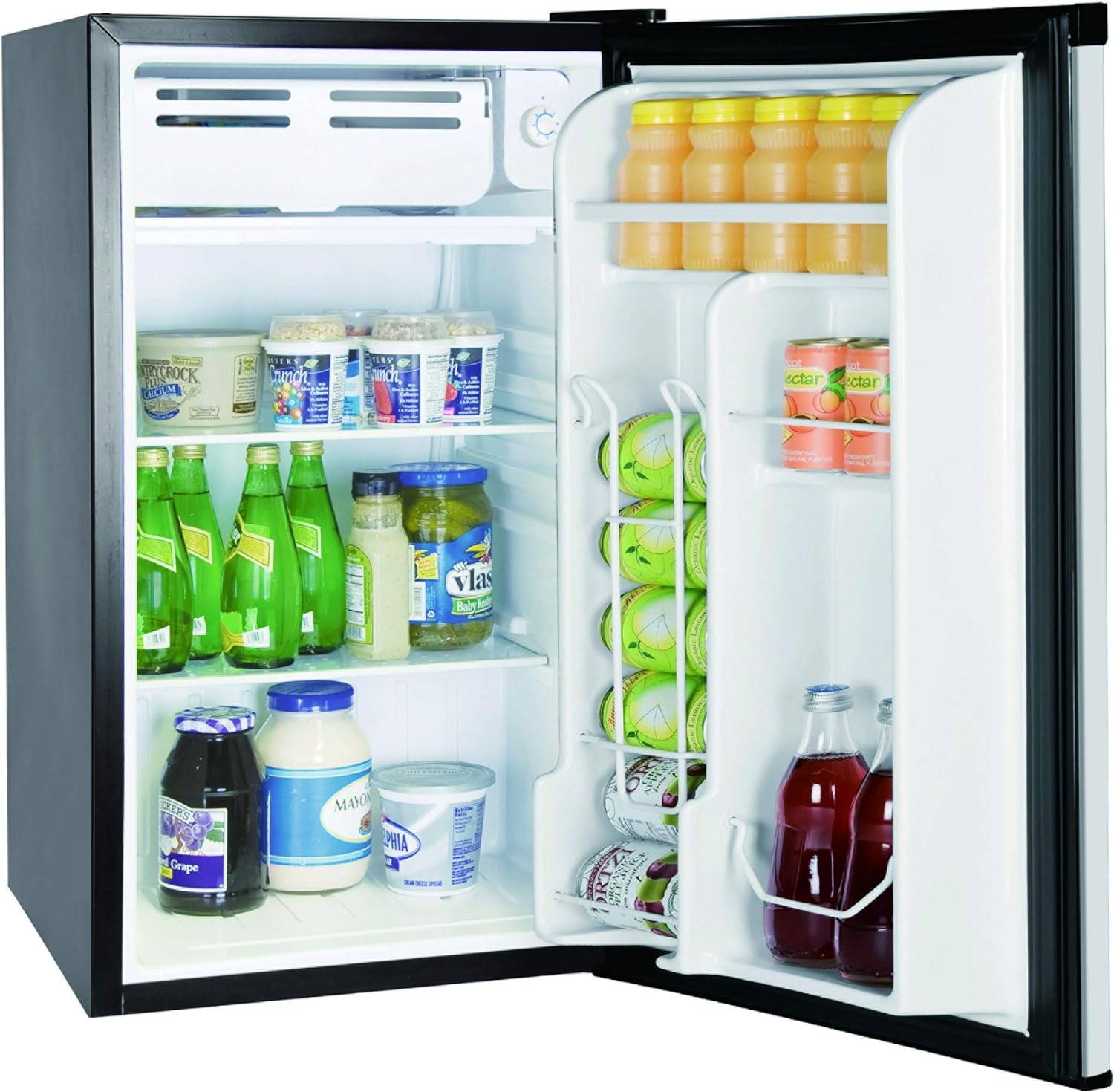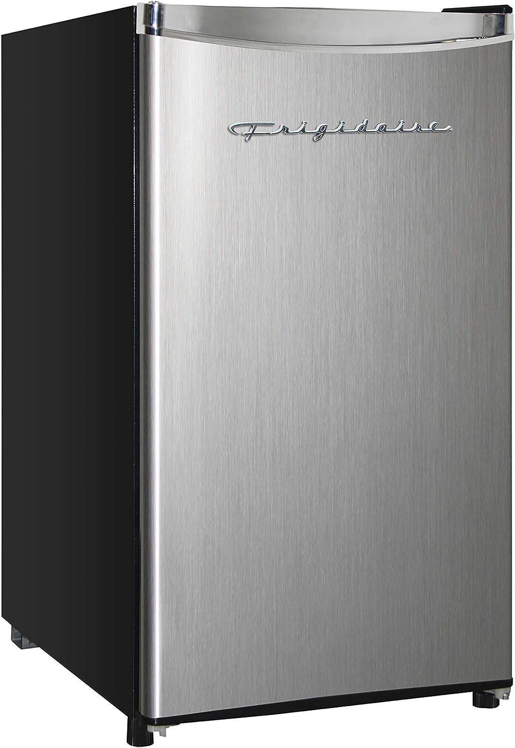 SPACE SAVING COMPACT REFRIGERATOR - This single door electric mini fridge is perfectly sized to keep your favorite beverages cool while taking up minimal space in your college dorm, RV, apartment, garage or office for ultimate performance even in hot weather ADJUSTABLE TEMPERATURE CONTROL - By turning the thermostat knob, our refrigerator can be adjusted to three temperature modes: Max, Med, or Min. The Med and Max modes are used to freeze ice inside the freezing chamber. While on Med mode, the temperature inside the refrigerating chamber is around 33 to 35°F. FOOD STORAGE with a FUN & STYLISH FINISH - Designed with a sleek black exterior that adds a classy touch to any room in your home or office. It features a single door and removable glass shelves that can be adjusted if you want to tuck something a little taller in the fridge REVERSIBLE DOOR with REMARKABLE STORAGE - This unit is designed with a roomy interior to store your extra food and beverages in an organized way. Its reversible door offers a spot for your favorite canned beverages, as well as a compartment that can hold a liter of soda or a bottle of wine. LOW Energy Consumption; Built in Can and Bottle Holder for drinks