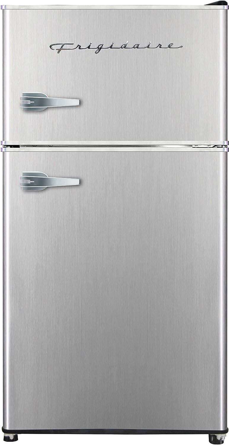 Top Freezer Refrigerator is more spacious than a mini-fridge. 0.96 cu ft freezer features ample storage space can be used to store ice cream. The door storage offer a convenient place to store jugs of milk, cartons of juice, or bottles of soda. Humidity-controlled crisper drawers help keep fruits and vegetables fresh longer. Incandescent bulb lighting makes it easy to see fresh food - it puts a spotlight on food and casts a more natural light on the contents of your refrigerator so food looks as it should. Electronic temperature control makes it easy to change the temperature when you need to. Reversible door design allows you to install the doors to open to the left or right, which is perfect for lunchrooms, smaller kitchens, wet bars and dormitories. Adjustable leveling legs offers convenience to situate fridge. The refrigerator has a large vegetable crisper, integrated door shelving for tall bottles, 2 full width glass refrigerator shelves help make cleanup easy so there's less reason to cry over spilt milk. Recessed handles make opening and closing the doors simple. Freezer Capacity: 0.96 cubic feet. Fresh Food Capacity: 2.24 cubic feet.
