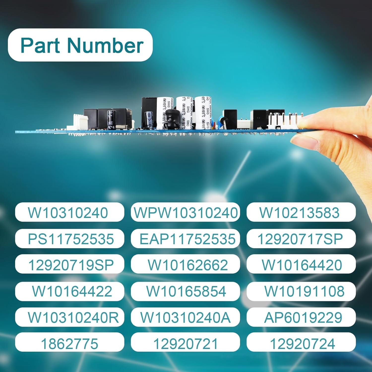 【Part Number】W10310240, WPW10310240, 1862775, AP6019229, PS11752535, EAP11752535, 12920717SP, 12920719SP, 12920721, 12920724, W10162662, W10164420, W10164422, W10165854, W10191108, W10213583, W10310240R, W10310240A. Compatibility of the W10310240 refrigerator control board depends on the refrigerator serial number. Please contact us with your refrigerator model and serial number before ordering to ensure that you are ordering the correct parts.