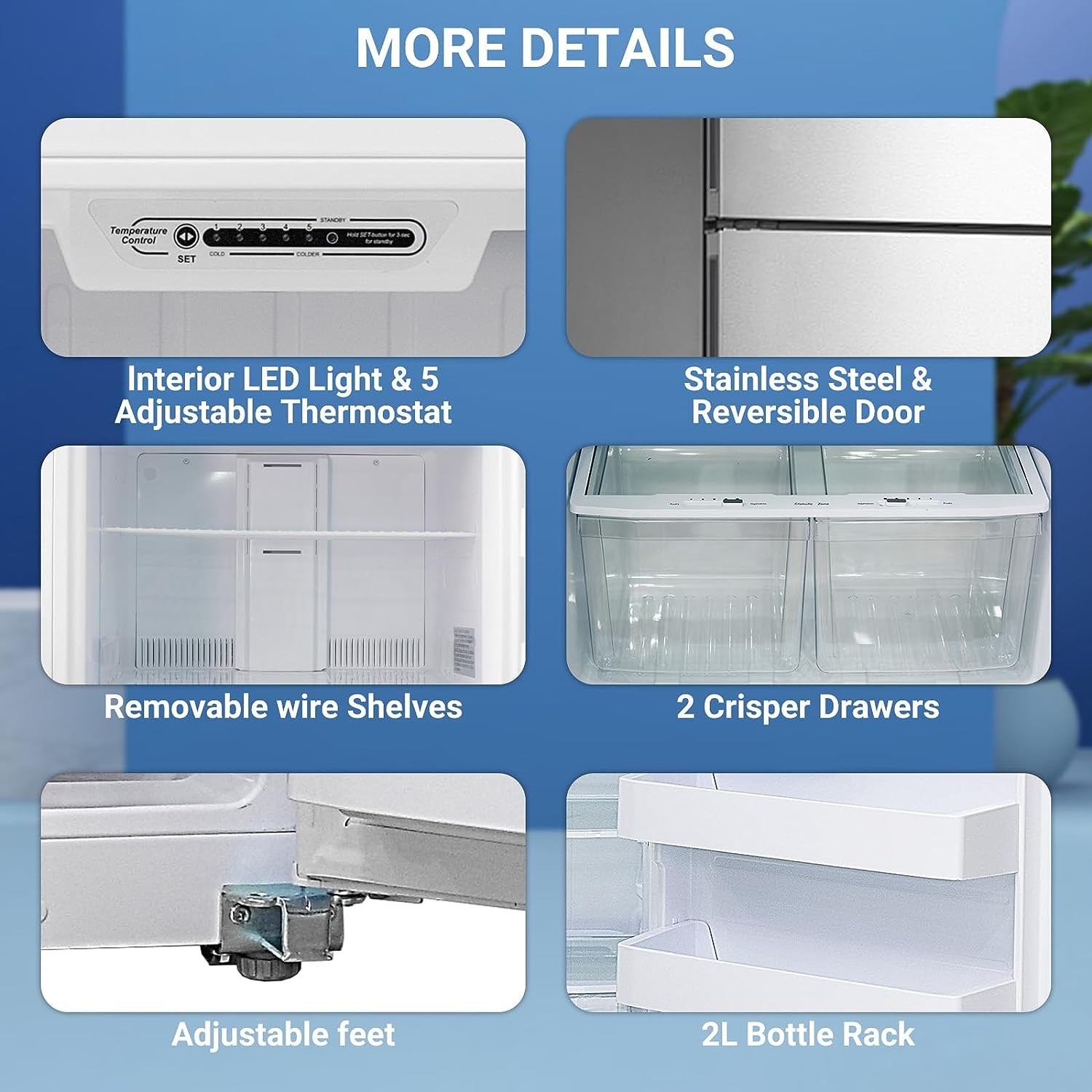 *Kitchen Refrigerators: The top mount freezer refrigerator 18 cu ft is Full-space frost-free design, Integrated circulating air, more efficient and stable refrigeration , provides ample storage for fresh and frozen items. The first time you see it, you will be amazed by the fine workmanship appearance of this refrigerator. *Large Storage Capacity: The 2 door apartment refrigerator with 4 Cu.ft Freezer, measures 29.53*33.07*66.62 inches for the perfect amount of versatile food storage space in your apartment kitchen, home, office or garage. *Slide-Full Width Shelf: Out storage shelves for easy access and removal of pies, cakes, casseroles, and larger food items, as well as LED lighting for a warm, natural light; Gallon door bins make it easy to store tall items and beverages alongside your favorite sauces, dressings and other ingredients. *Low Maintenance: Compact fridge is stable performance with R600a compressor, 5 conversion modes adjustable thermostat control, removable door handle, adjustable feets, minimize-noise, better refrigerating performance and less maintenance. *Freezer and Refrigerator Combo: We provide a 12-month warranty and any interests with this kitchen refrigerator|refrigeradores, please feel free to contact us at anytime