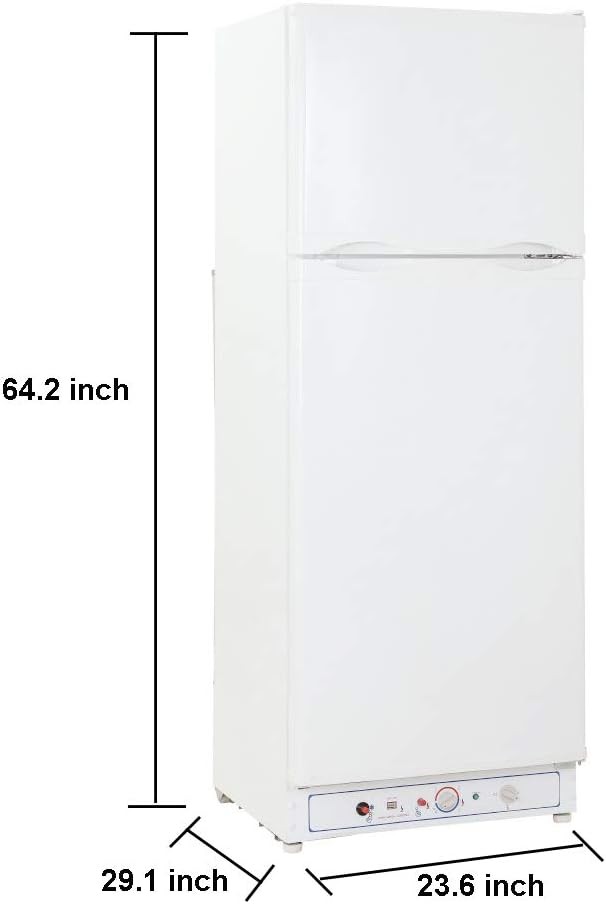 Propane refrigerator off grid: 110V/gas propane absorption refrigerator 9.5 cuft with freezer, measuring 23.7 * 29.1 * 64.2 inches, It uses the absorption refrigeration method and has no noise with no vibrations.