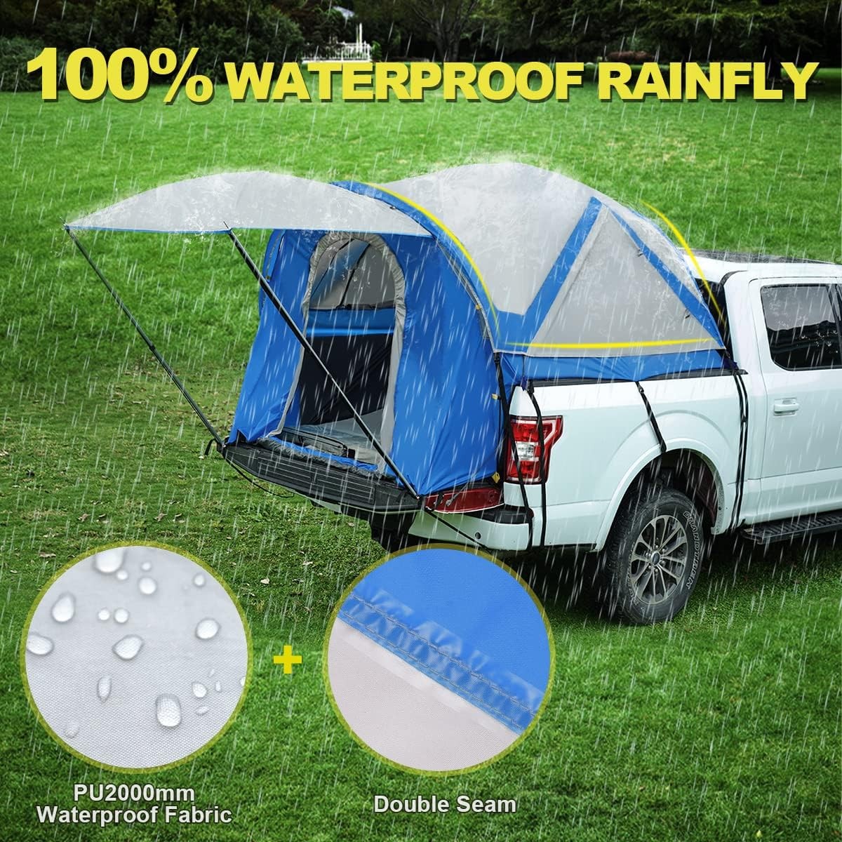 WEATHERPROOF STRUCTURE - This pickup bed tent is constructed of water-resistant fabric with tape-sealed seams (PU 2000mm), which can keep your car clean and dry.Quick build or remove in 5 minutes.PU 4000mm Fully sealed floor, keep the room clean and dry so that you have a comfortable sleep.