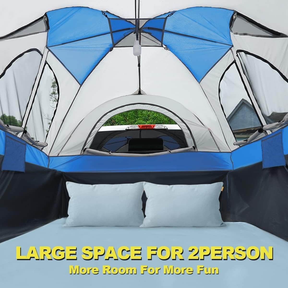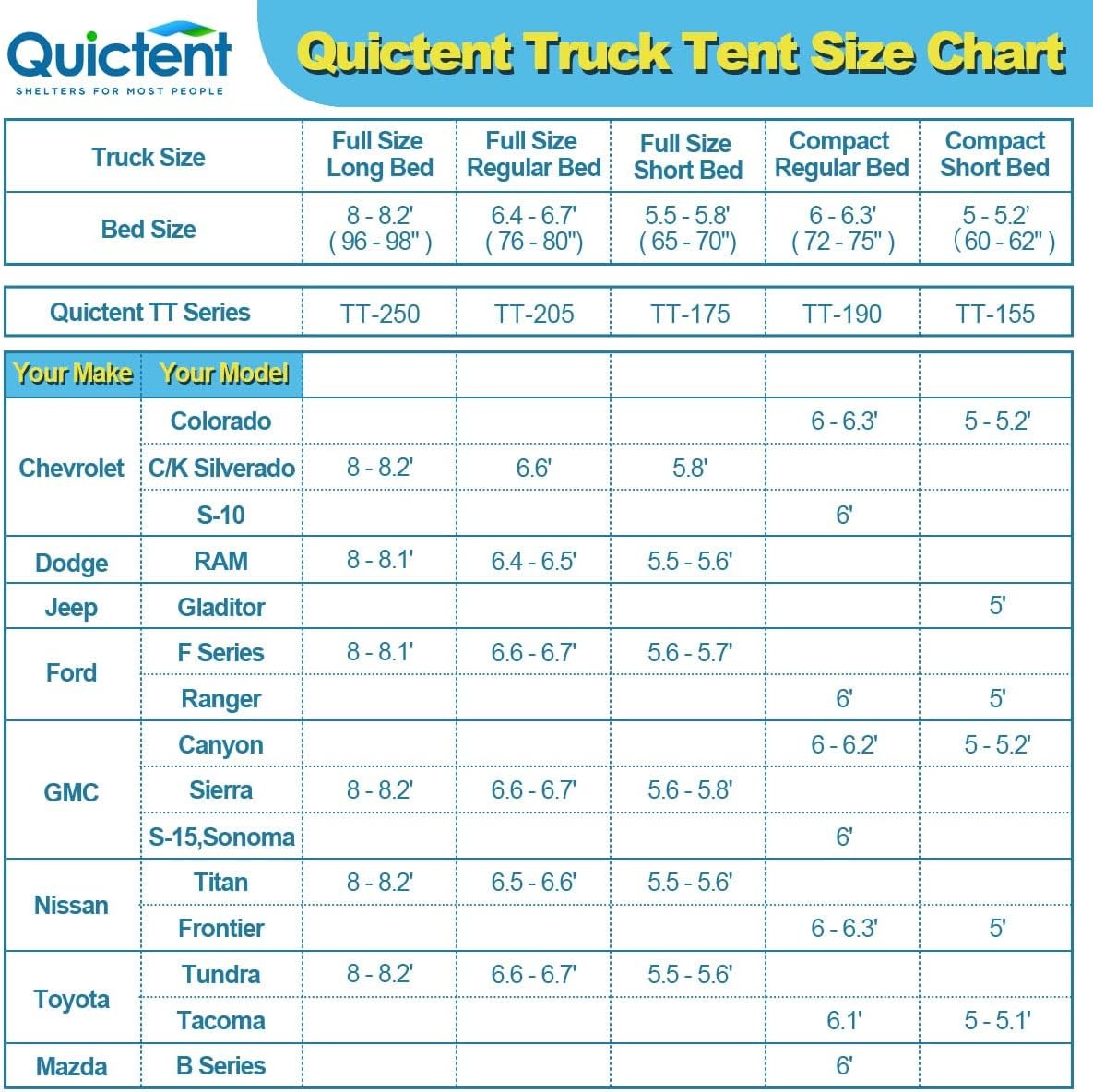 LARGE SPACE - 71'' width for 2 persons, 63'' headroom makes staying inside more. 81'' length fits all 6.4' - 6.7' truck beds, Please measure your Truck bed first.