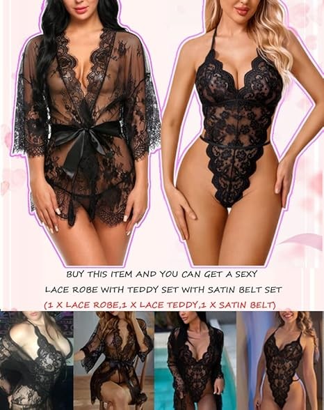 Avidlove Women Sexy Lingerie Set 2 Piece Lace Kimono Robe with Lace Teddy Lingerie Bodysuit