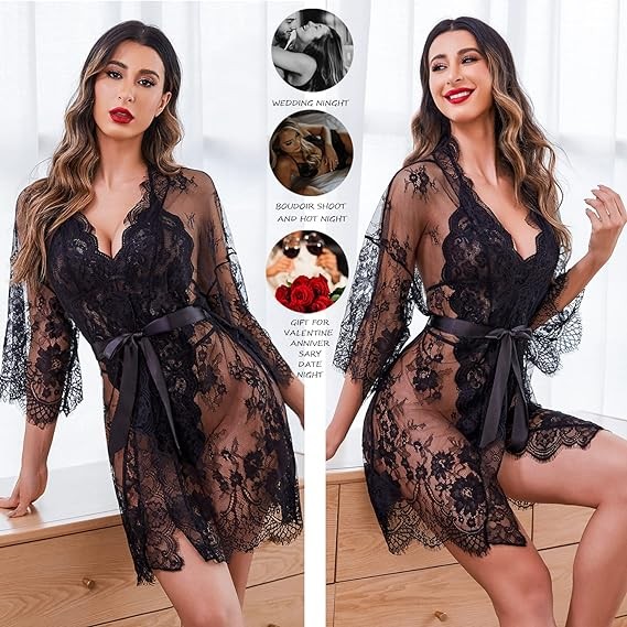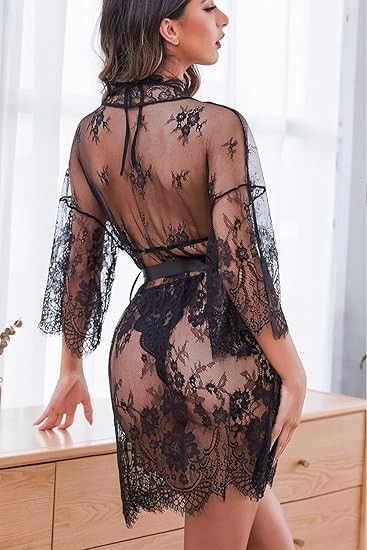 • Sexy Robe:Cover up,look elegant while being comfortable in this lovely sheer lace robe with butterfly sleeves,a mini length,a matching g-string and a satin belt