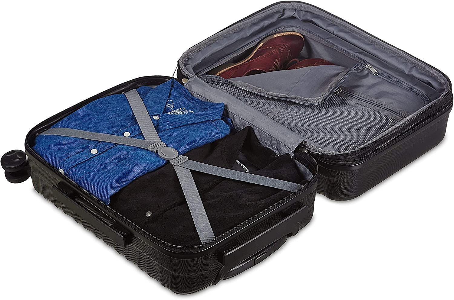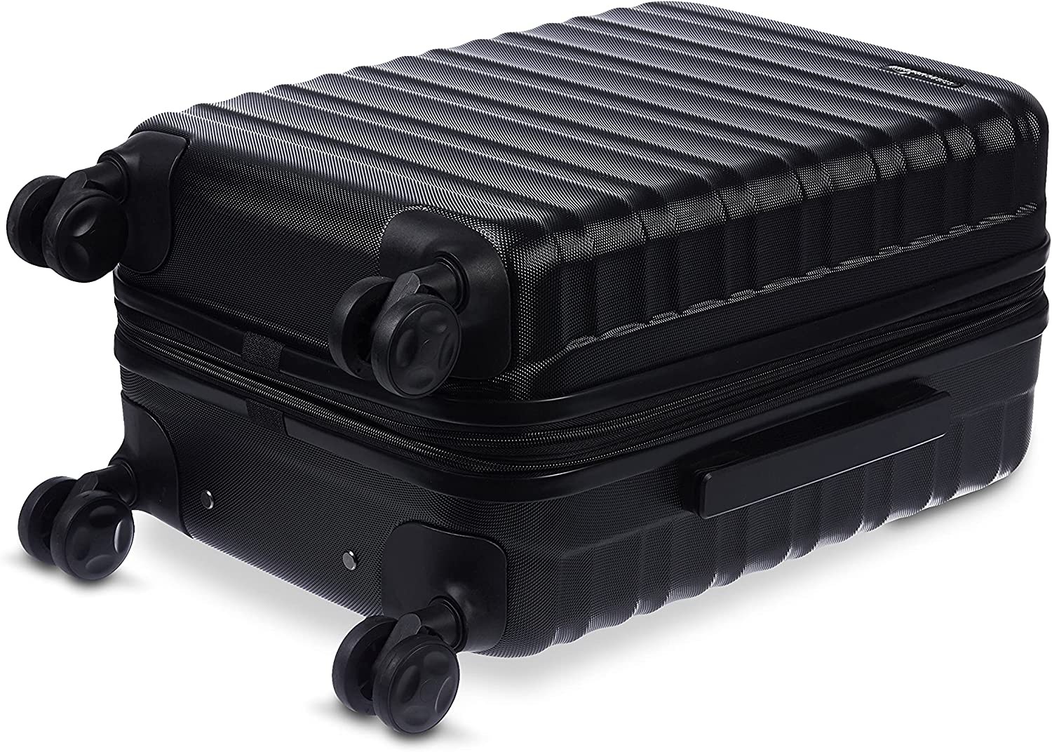 Hardside spinner luggage for work travel, weekend getaways, or as international carry-on Includes a 21-inch hardside spinner with a protective extra-thick ABS hard shell and a scratch resistant black finish 4 double spinner wheels ensure smooth-rolling mobility in any direction Sturdy telescoping handle for comfortable maneuvering and a securely mounted short handle for easy lifting Fully lined 150D-polyester interior organizer with divider, plus 3 zippered pockets for storing smaller items Expandable for up to 15% more packing space when needed Product dimensions: 10 x 14.9 x 22 inches (LxWxH, including wheels); interior dimensions: 9.6 x 13.3 x 18.5 inches (LxWxH)