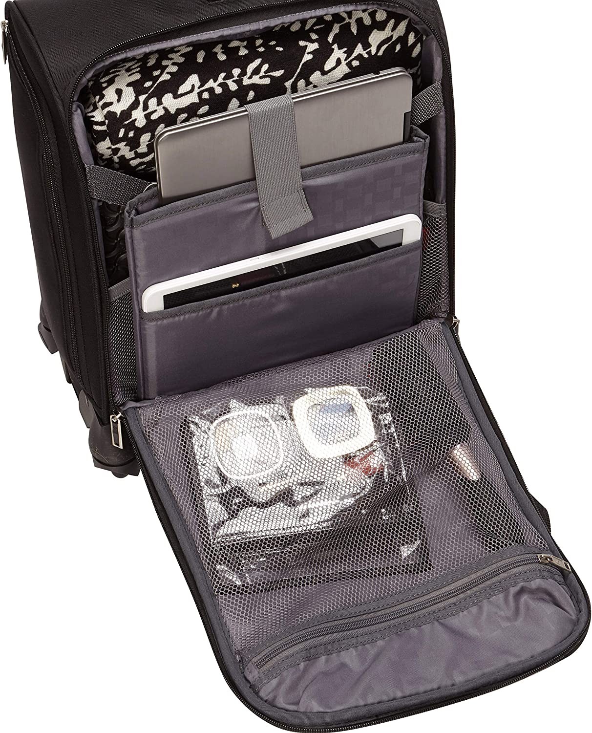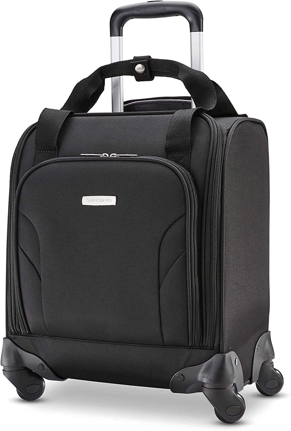 Fits Under Most Airline Seats for easy access to belongings en route, please check with your Airline for more information as under seat storage capacities and dimensions can vary 4, Multi directional spinner wheels allow for 360 rolling in multiple directions for easy mobility USB Port lets you charge electronics on the go (batteries not included) Ergonomic, Push Button Locking Handle is designed to fit comfortably in your hand Quick stash exterior pockets for increased packing organization of smaller items Main Compartment features a padded laptop Compartment that fits laptops up to 13.3 inches. The pocket does have an elastic band to secure the laptop as it peeks out of the pocket Smarts Sleeve on back allows bag to be placed over handle of most upright luggage pieces The internal attributes are 15 x 13 x 8 inches ,Overall Dimensions: 16.5 inches x 13.75 inches x 9.0 inches, Weight: 7.0 pounds Limited 3 Year Warranty