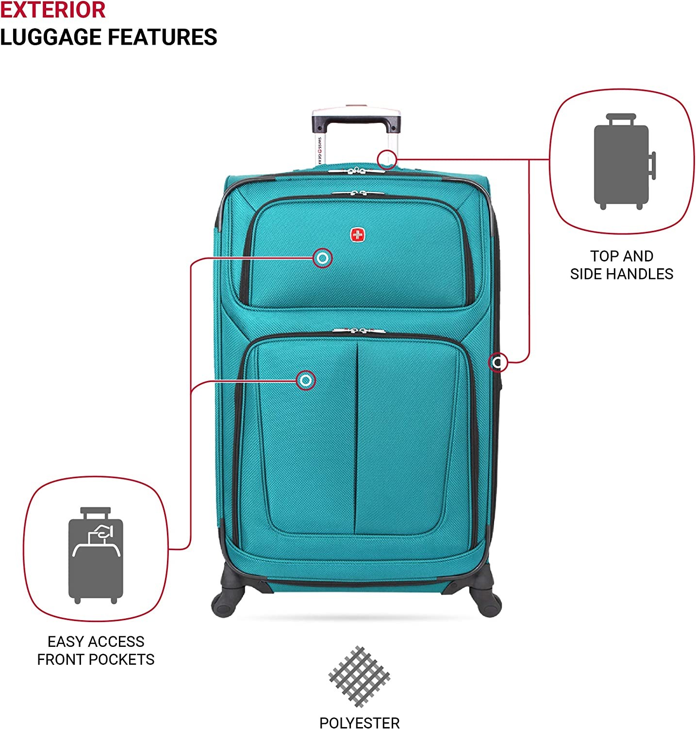 Rolling Suitcase: Get through a crowded airport easily with this stylish check-in luggage with 360-degree multi-directional spinner wheels and a locking retractable push/pull handle Multiple Front Panel Pockets: Featuring front pockets with a built-in ID tag, this ergonomically expandable luggage measures 30 x 18.5 x 12.5 inches including wheels and handles; packing dimensions are 28.5 x 17.25 x 12.5 inches Secure and Durable: Expandable travel case gives you ample parking space and made from a durable, scuff-resistant polyester fabric with fully lined interior; also features adjustable tie-down straps for securing garments in place Effortless Organization: This luggage bag maximizes packing efficiency with a removable zippered wet bag, large mesh lid pocket, and packing pocket for holding small items and accessories Convenient Side Handles: With reinforced padded top handle with an integrated side and bottom handle, this roller suitcase makes lifting and carrying your luggage easy