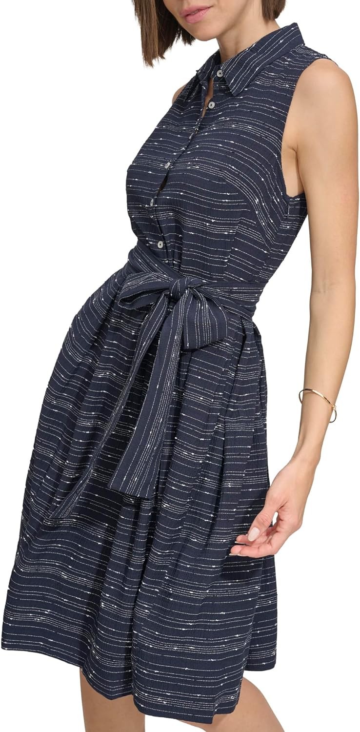 Features: dress, sleeveless, stripe gauze fabric, point collar, button front, self tie belt