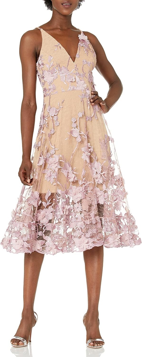 Dress the Population Women's Audrey Spaghetti Strap Midi A-line 3D Floral Dress