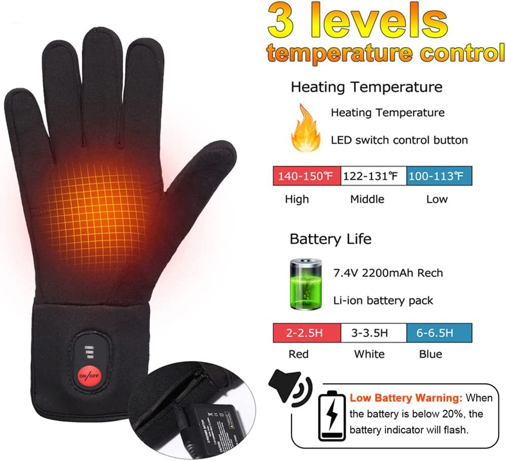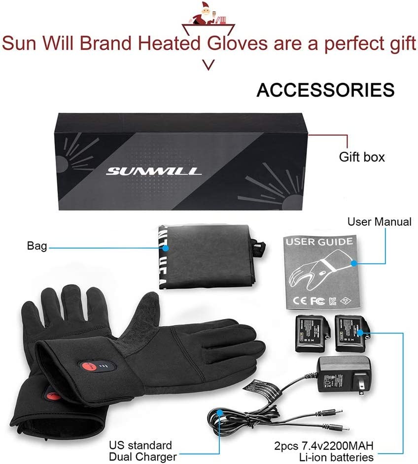 【Soft Breathable Material】Thin Heated gloves liner,can wear with other gloves.Made of Lycra outside, Soft and breathable on palm, electric modules using thin, soft,You can be more comfortable movement.It's a comfortable and practical thin heating glove liner great for cold weather.Hand wash or Machine wash(must put heating gloves liner into wash bag). 【Superior Heating Elements】Battery Heated gloves,Upgraded Far infrared fiber heating elements covers whole back of the hand,fingers and finger tips.Warmer than ordinary battery heating gloves on the market.Especially the fingertips can give you more warmth.Perfect for anyone working in the cold. Rechargeable heated gloves can be stimulate your hands blood circulation.Great for people who with Raynaud's,Arthritis,Bad Circulation ,Stiff Joints.Say goodbye to cold hands. 【Large-capacity Li-ion Batteries&Touch Sensor】Those Heated Gloves with touch screen functionality on finger will work on smart device. The heating Mitten gloves with 2 Rechargeable batteries ,Safe and effective US standard dual charger.3 heat setting and adjust the temperature easily.Heating Up to 7 Hours in Low gear.(Full Charged).add low power warning function.7.4v 2200mah large-capacity battery life for Electronics Gloves is longer and safer than ordinary 3.7v batteries on the market. 【Excellent warmth】Those electric gloves liners for men and women perfect for Winter outdoor indoor work, like driving,riding, fishing, walking dogs, running, Outdoor work,heating and durable.Give you warmth and comfort for a long time.Won't shock, even when wet!The battery heating gloves Include:One pair gloves, two unit 7.4V 2200mah batteries, US dual charger, portable storage bags and instructions.It’s convenient to carry around. 【High Quality After Sales Service】If you are not completely satisfied with Sun Will Heated thin gloves, We Will Replace It with a New One or Refund your Money back.If you have any further questions or any quality size problems ,Please contact us by email free. we will assist you ASAP within 24 hours .