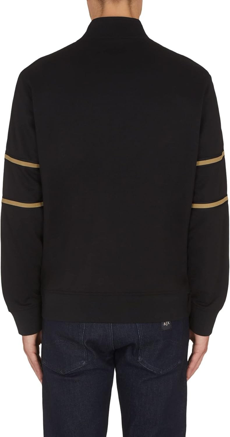 This zip-up long sleeve sweatshirt features gold details within the logo, and on sleeve edges in perpendicular lines. An elevated sporty look with two functional pockets and a mock-neck length collar. A|X Armani Exchange logo patch on left breast.