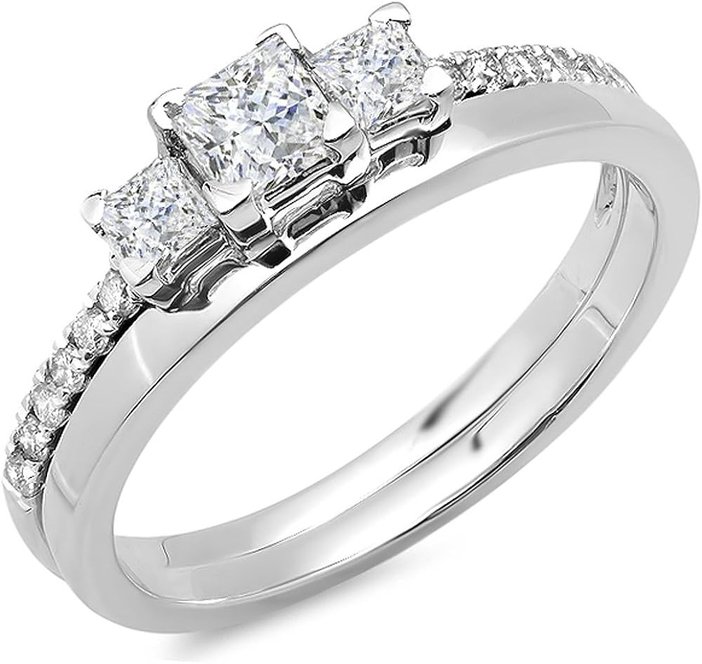 Dazzlingrock Collection 0.85 Carat (ctw) 14K Princess & Round Diamond 3 Stone Bridal Engagement Ring Wedding Band Set, White Gold