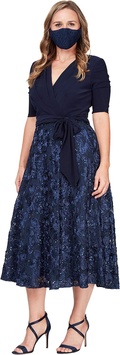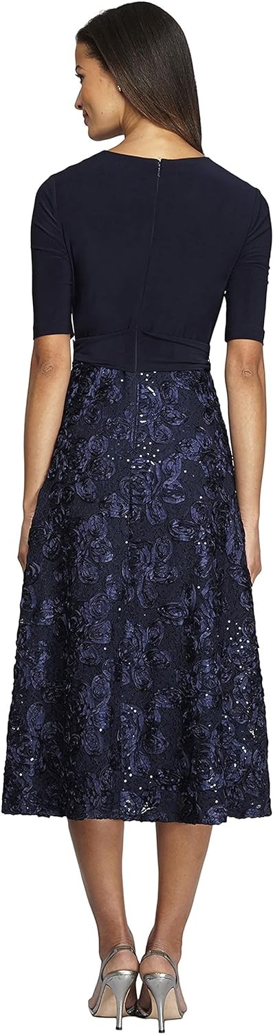 Alex Evenings Women's Tea Length Dress with Rosette Detail
