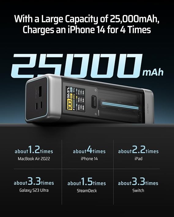Mega Battery Life: Packed with a Auto-Grade battery, it's built to last with over 1000 charge cycles. That's over three times the lifespan of ordinary power banks. With its reliable 25000mAh power source, the portable charger can charge your MacBook Air 1.2 times or your iPhone 15 up to 4 times. It's the power you can count on.