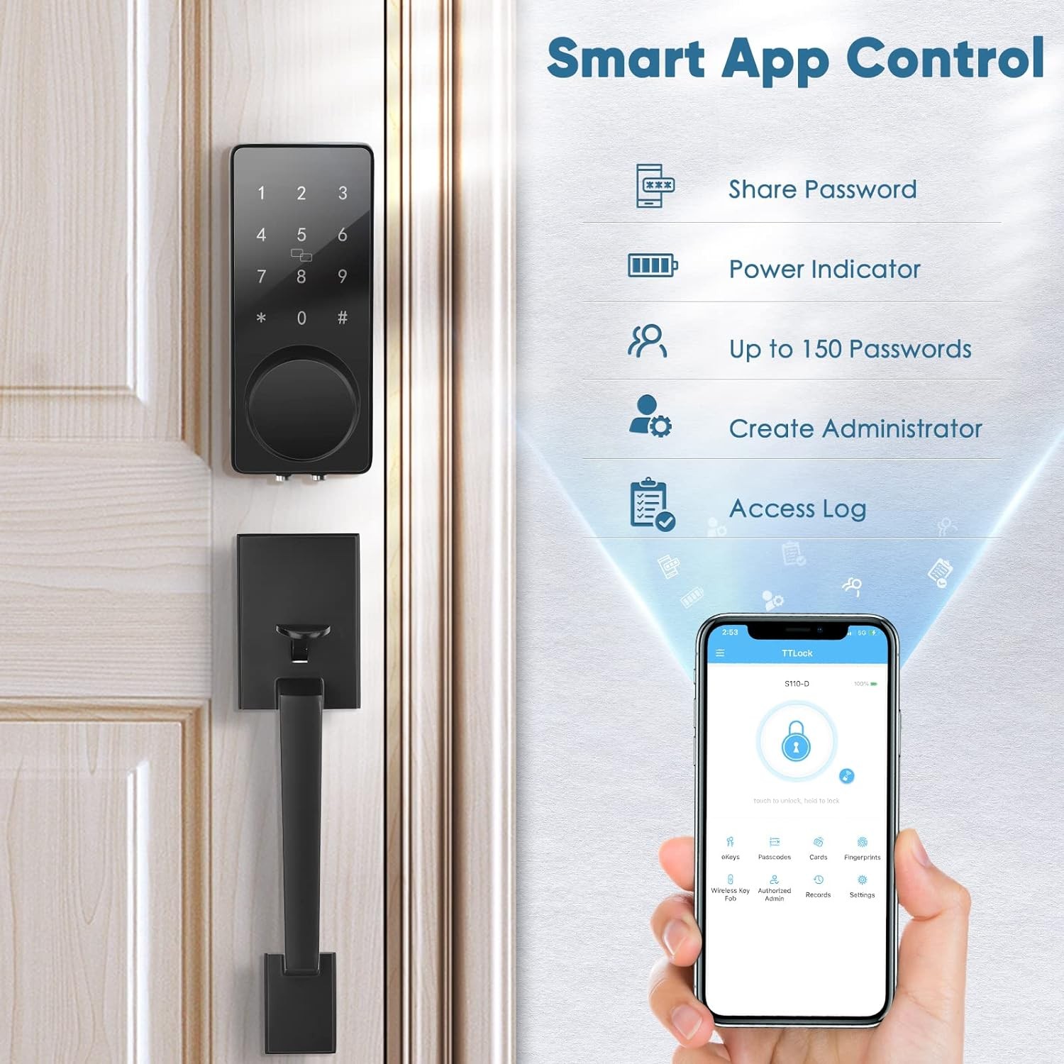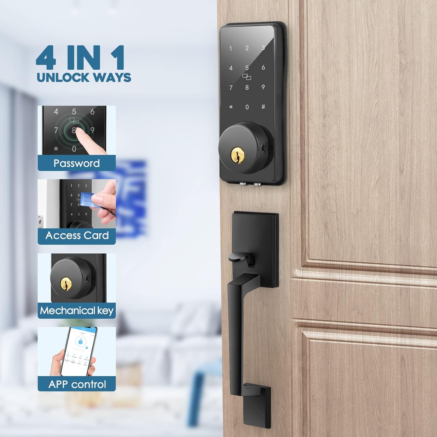 4 in 1 Smart Front Door Lock Set, Keyless Entry Door Lock with Handle, Touchscreen Keypad Deadbolt, Works with App, Auto-Lock, Code Door Lock, Easy Installation