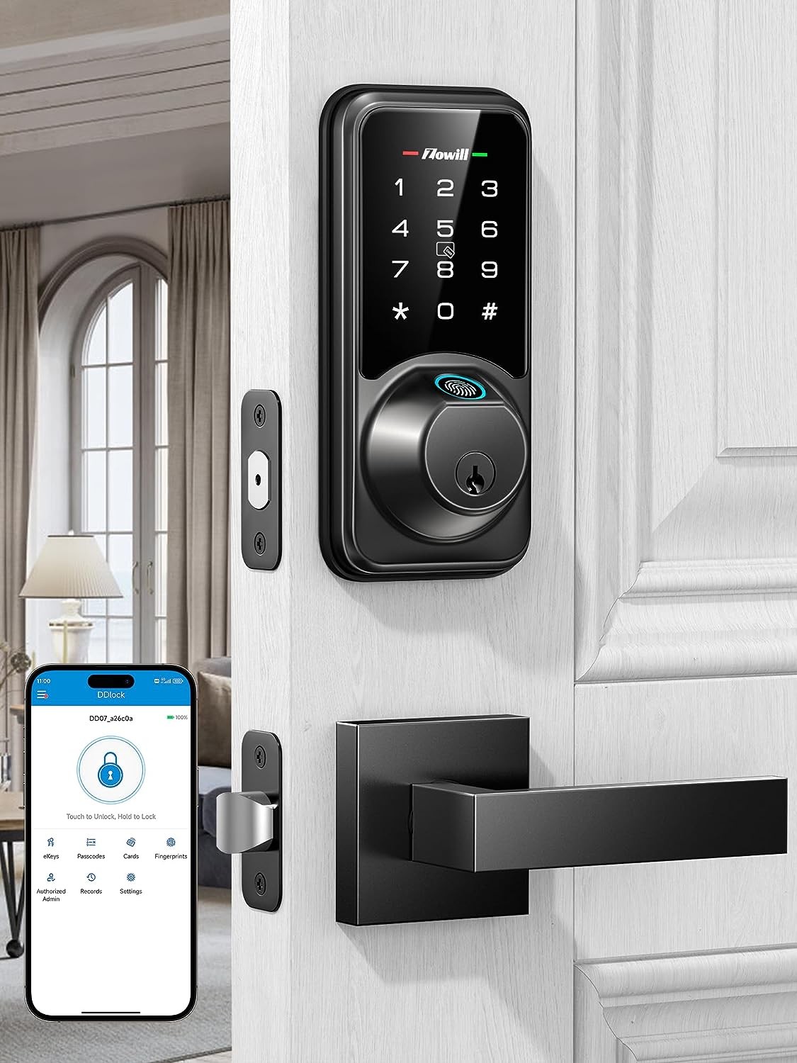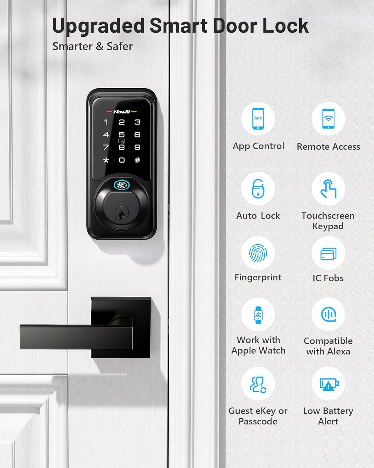 Smart Door Lock Set for Front Door, Zowill 7-in-1 Fingerprint Deadbolt with App Control, Keyless Entry Door Lock with 2 Lever Handles, Biometric,Touchscreen Keypad, Auto Lock, Matte Black