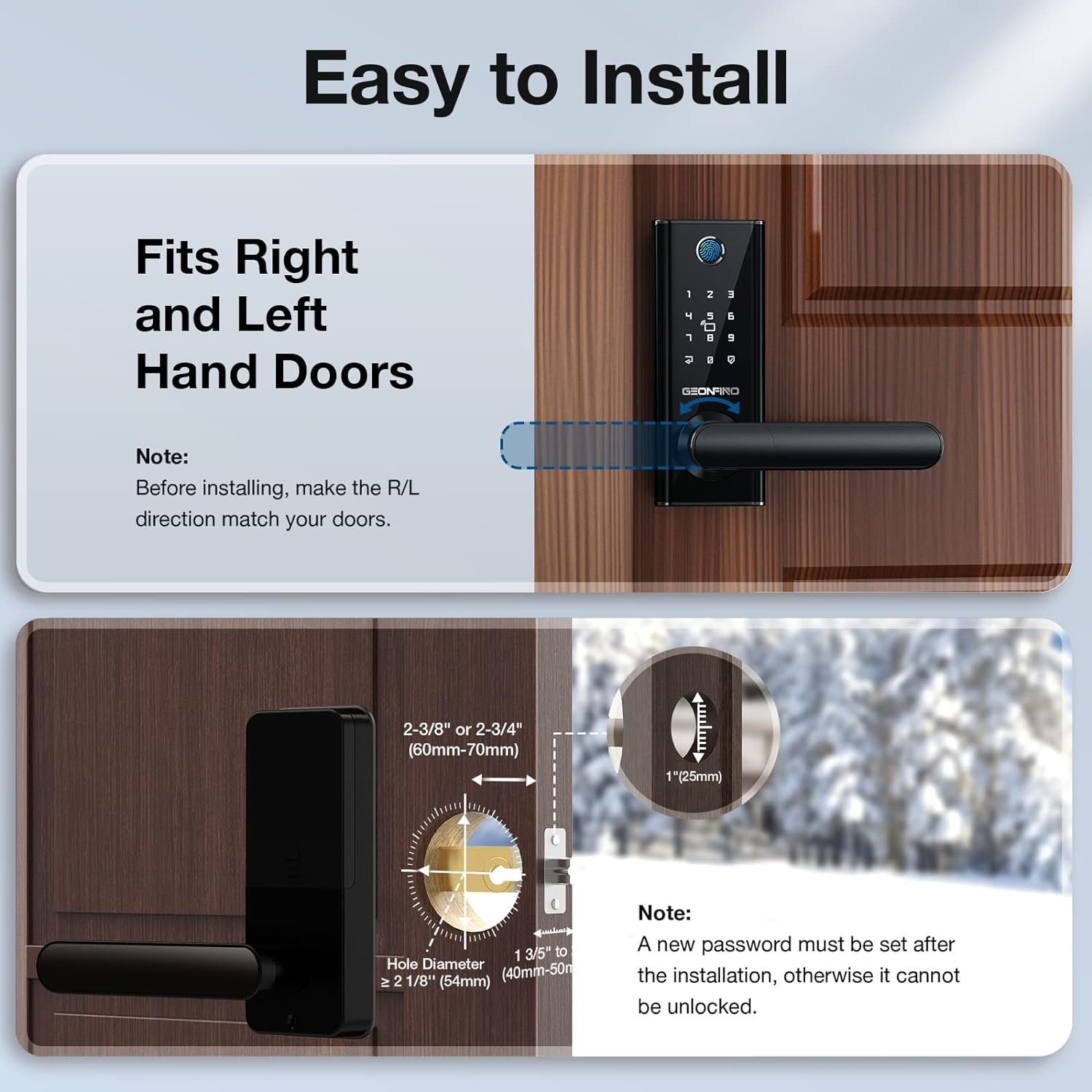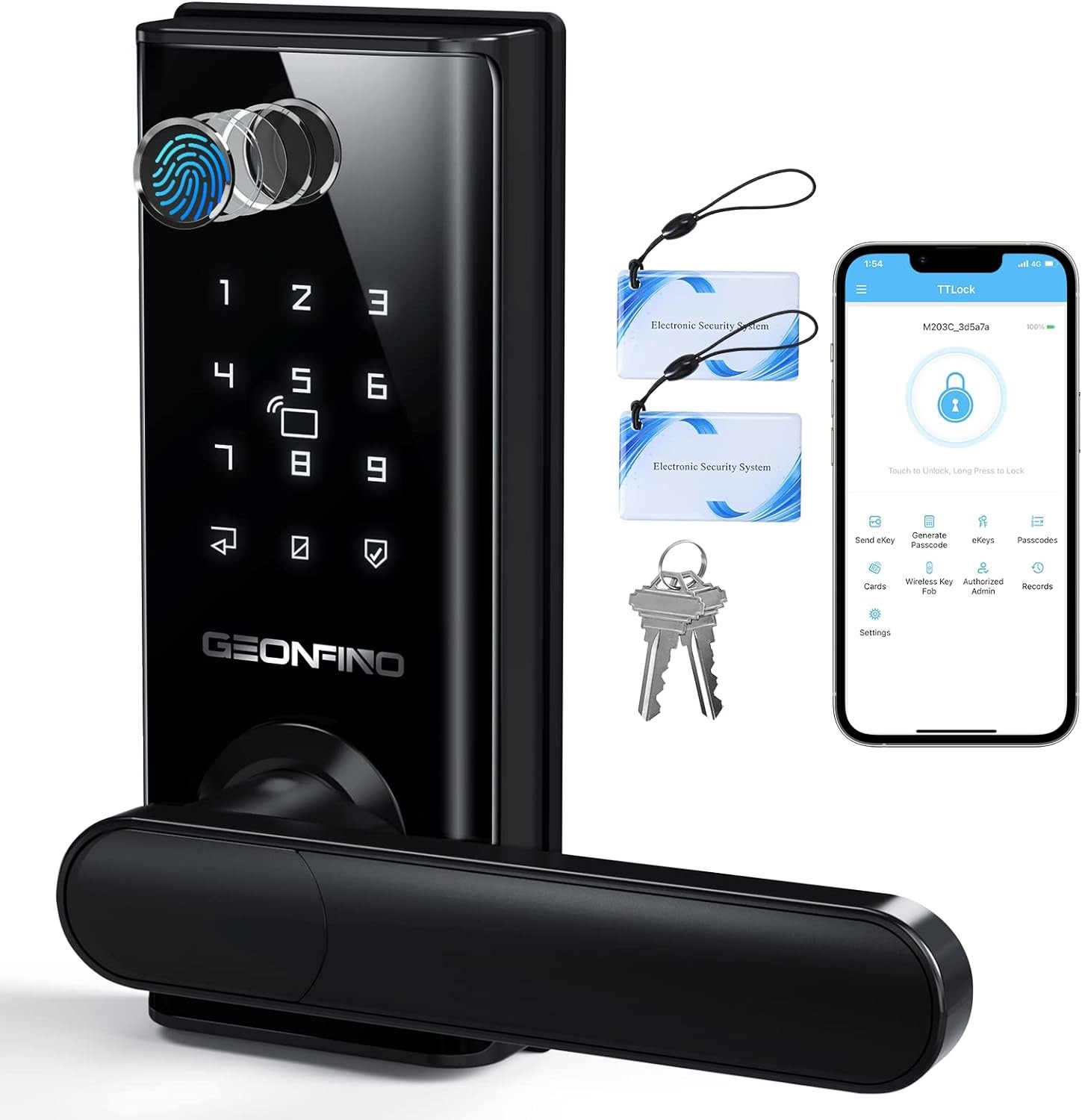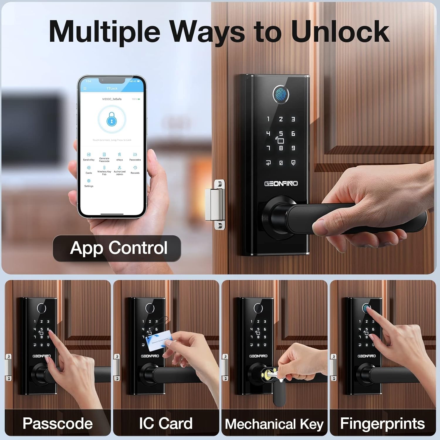 GEONFINO Keyless Entry Door Lock, 6-in-1 Front Door Lock with App Control, Bluetooth, Fingerprint Door Lock with Handle, Electronic Digital Keypad, Smart Door Lock with Anti-Peeping, Auto Locking