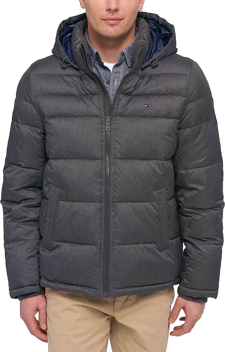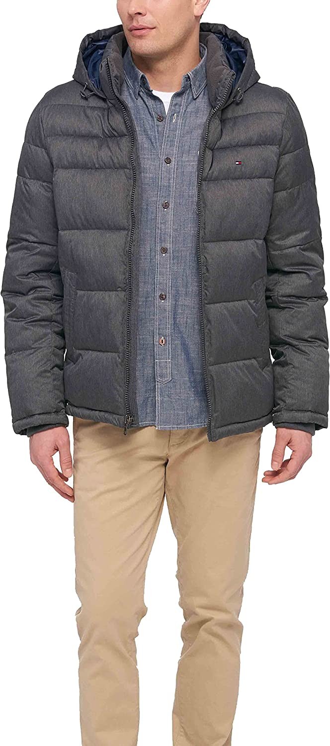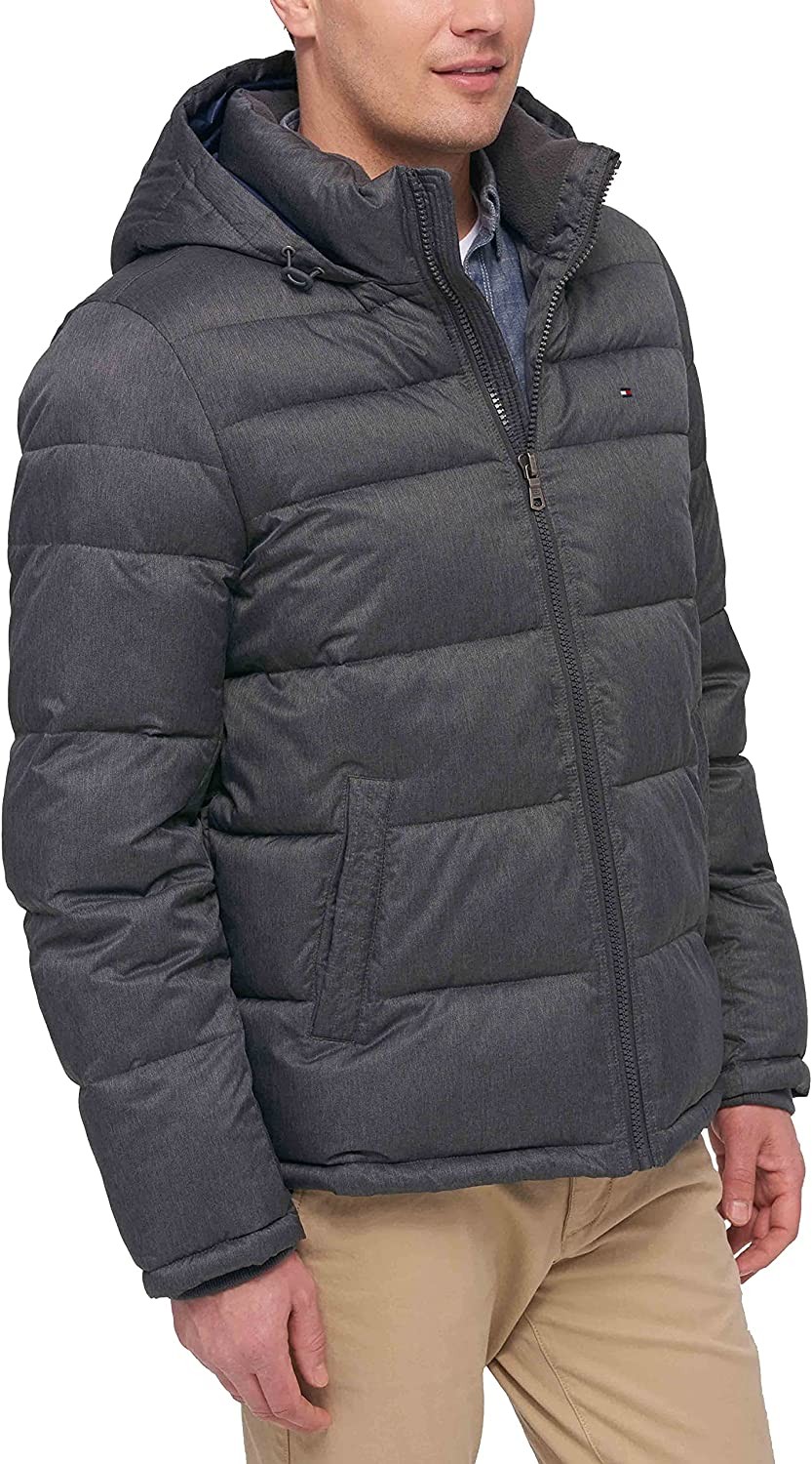 100% Nylon Imported Pull On closure Machine Wash WARMING FEATURES: This nylon puffer jacket has the role of blocking out the cold; It contains advantageous features such as rib knit storm cuffs and a fleece lined stand collar; Each feature adds to the insulation of the jacket FUNCTIONALITY: A center front zipper along with two side pockets gives viable storage; The fleece lined collar contains adjustable draw cords for insulation and warmth STYLISH FEATURES: The jacket demonstrates the signature look of Tommy Hilfiger with an embroidered flag on the left chest; The cuffs also exuberate authenticity with a Tommy Flag placed on the inside of the cuff