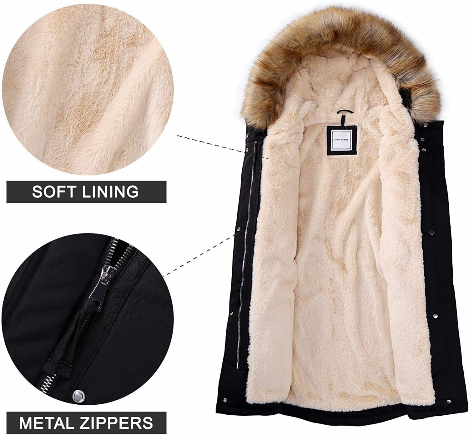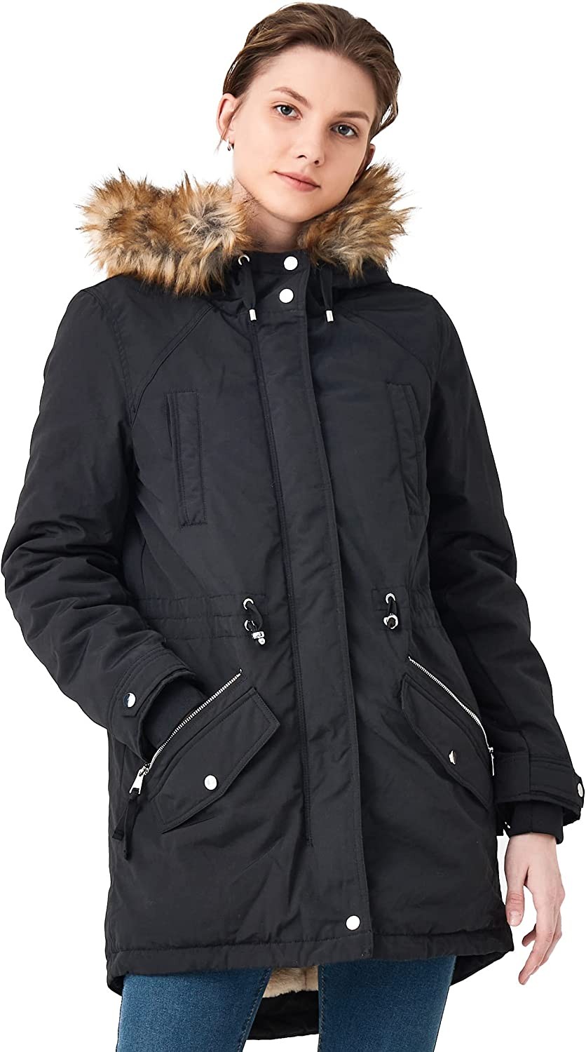 Shell: 85% Polyester, 15% Cotton Imported Front flap with Full-zip & snap closure Machine Wash 【Cold Fighter】The water-resistant and windproof fabric of the womens winter coat retains more body heat without sacrificing breathability. Faux-fur lined hood and body enhanced the warmth. Attached hood with a detachable faux-fur trim and drawcord can better protect your head from cold. The ribbed cuffs can perfectly block the wind out 【Multiple Pockets】2 side entry fleece lined chest pockets with snap closure, 2 dual entry hand pockets with warm fleece lining and 1 zipper inner pocket can warm your hands and safely storage your essentials 【Better Show Your Beauty】Adjustable waist drawstring of the winter parka coat can better show your graceful curves. Mid-length and drop tail hem design can cover your bottom and thigh. The cozy and fashion winter coat could keep you warm while still flattering your figure 【Available in Multiple Sizes】This parka coat has multiple sizes for you to choose from, so you can pick the one that best suits your figure. Please refer to our size chart for a suitable and comfortable size for yourself or other important people 【Long-lasting Use】The fabric of the winter parka coat is durable, not easy to break after repeated wearing and washing