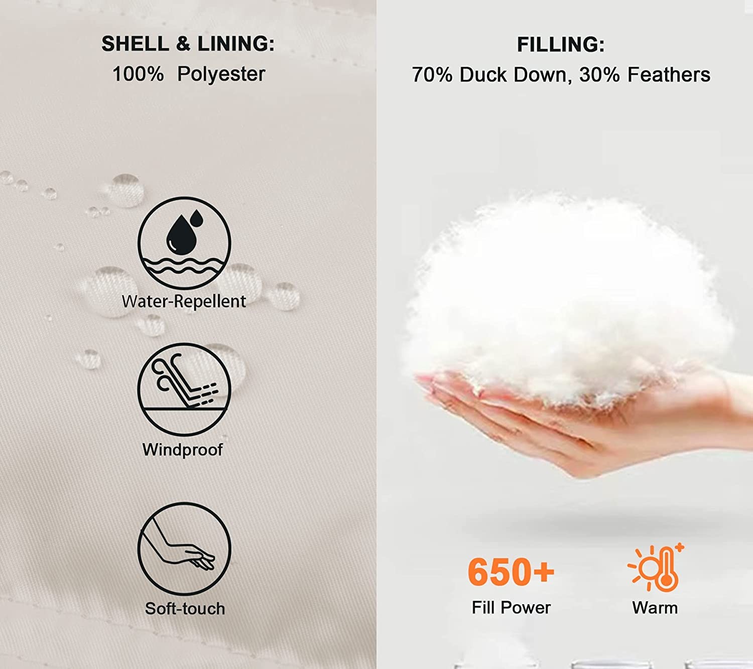 Shell & Lining: 100% Polyester, Filling: 70% Down, 30% Feather. 650 FP