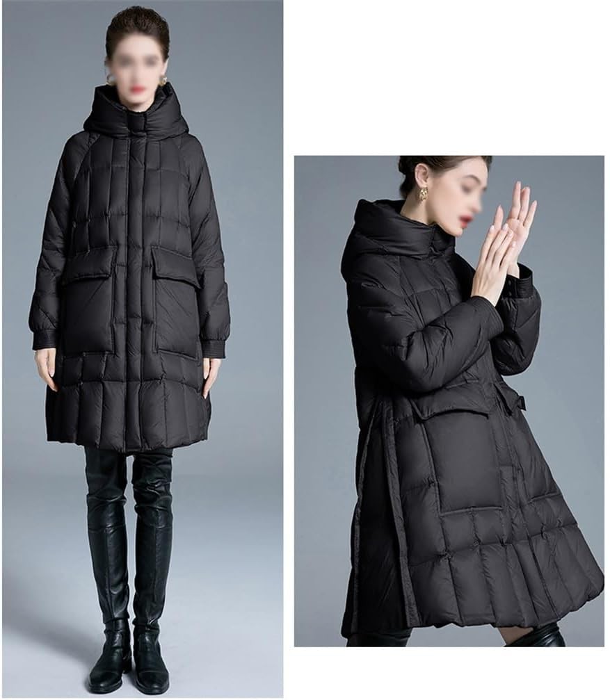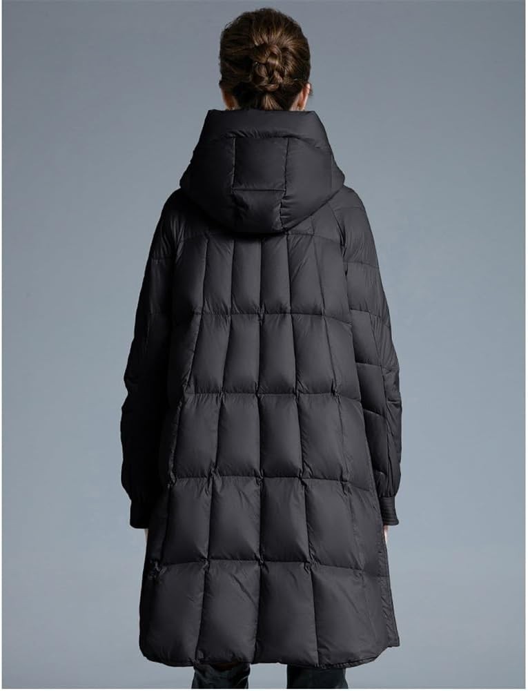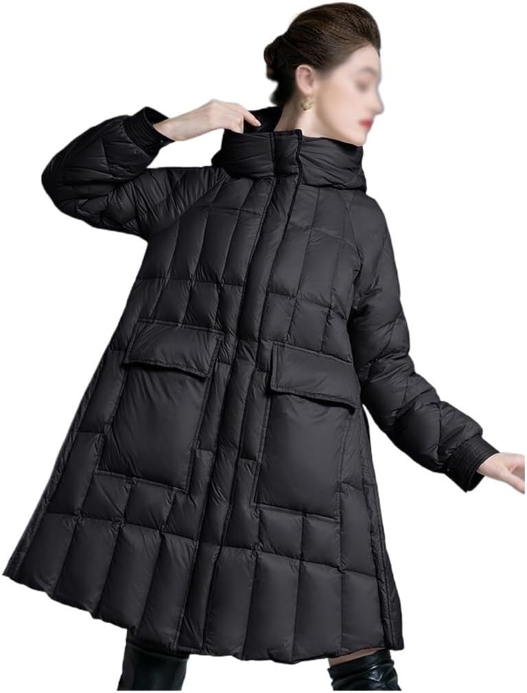 Douxie Down Jacket Women's Mid-length A Swing Thickened Hooded Loose Thin White Duck Down Black Jacket