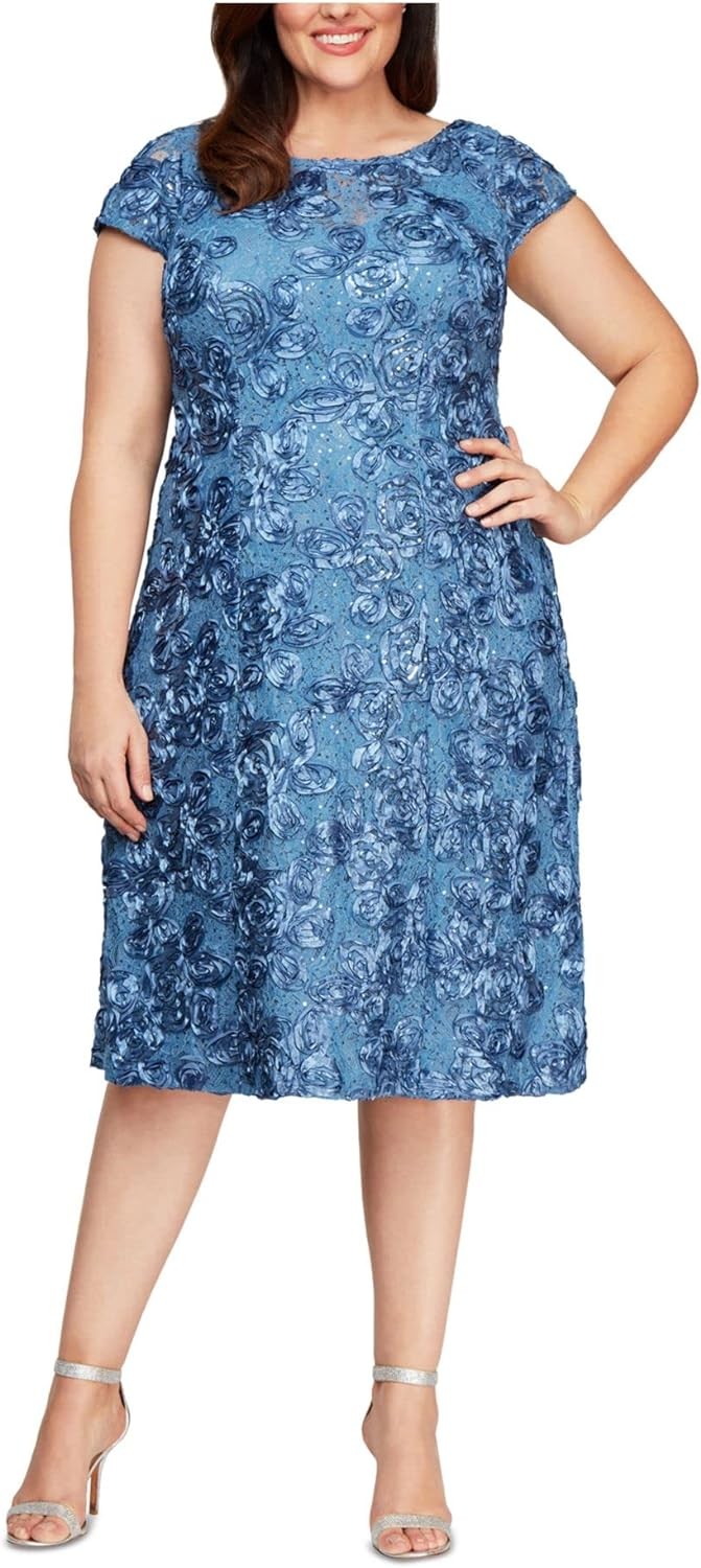 Alex Evenings Women's Plus Size Tea Length Dress with Rosette Detail