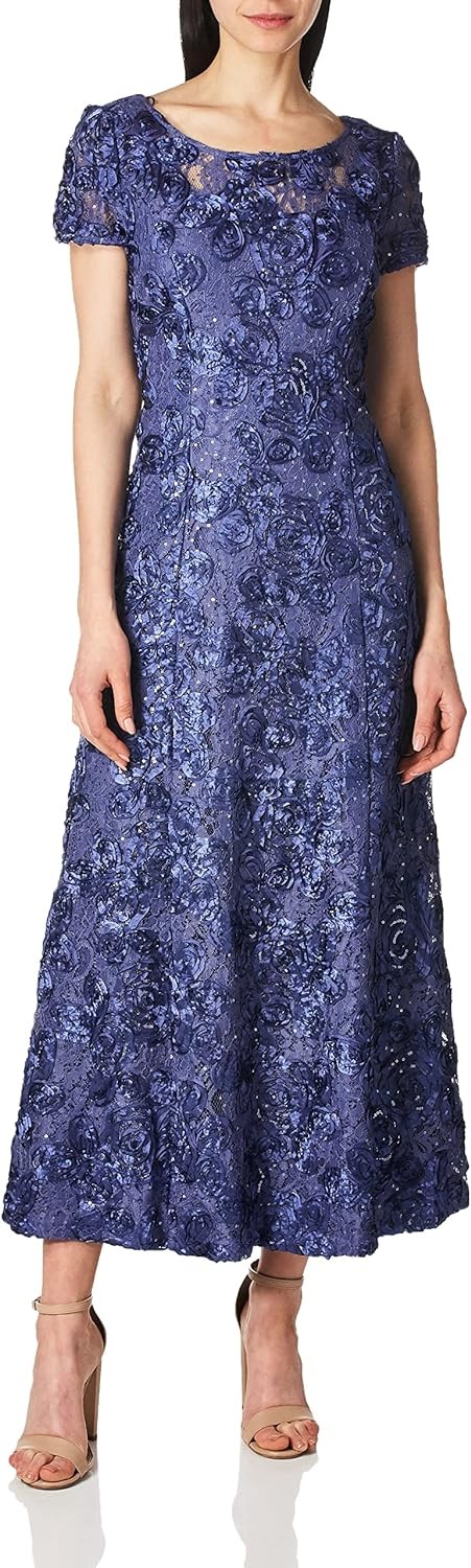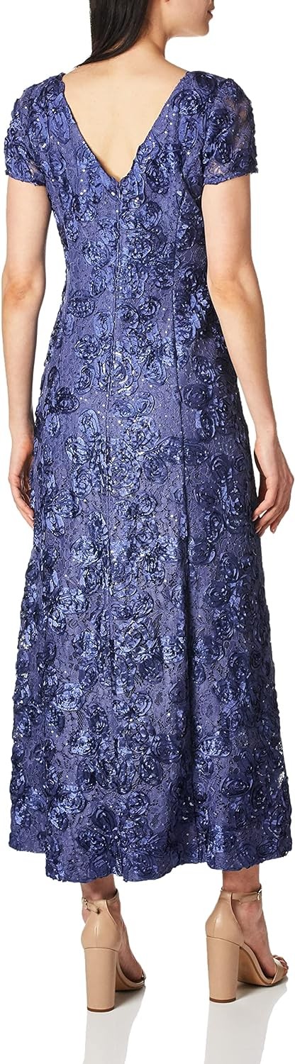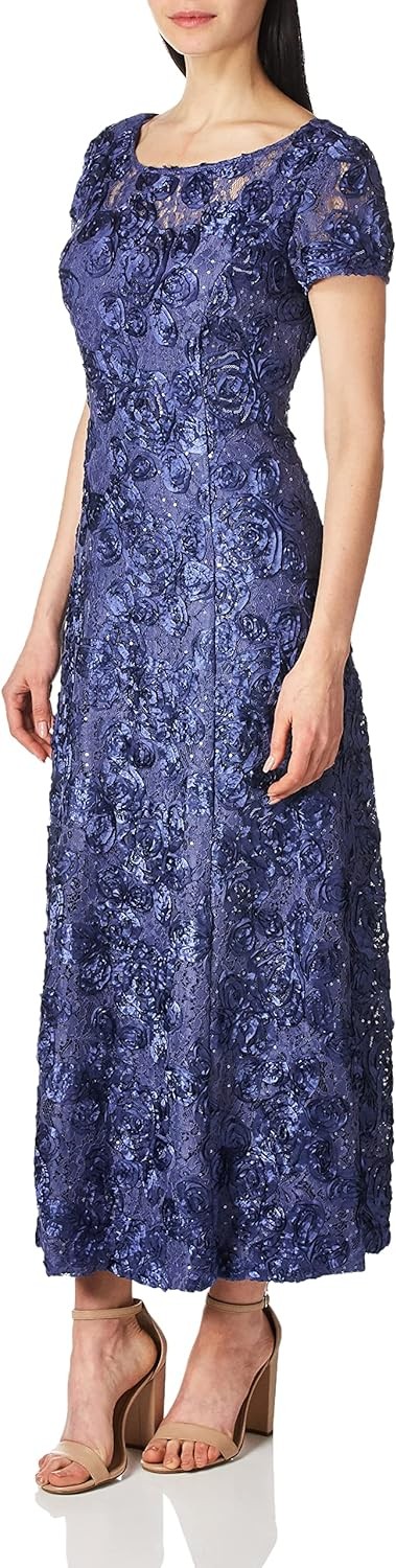 Alex Evenings Women's Long Rosette Lace Cap Sleeve Gown