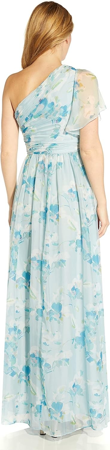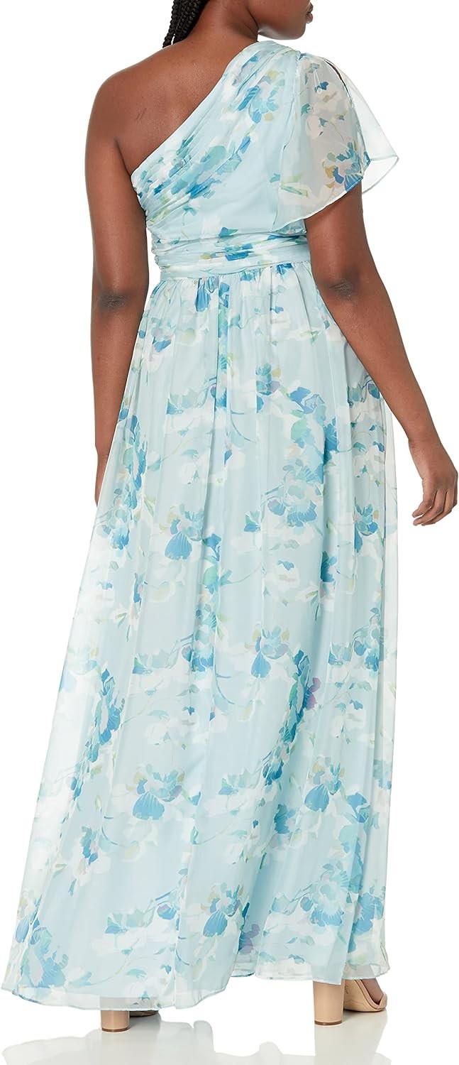 Chic and unique: sexy off-the-shoulder dress designed in a lightweight woven organza in a romantic floral print Obsessed with the sheer single flutter sleeve Gently fitted ruched bodice, while gently pleats along the waist create more fullness Beautiful for mothers-of-the-bride/groom wedding guests and party hoppers