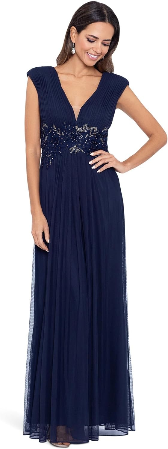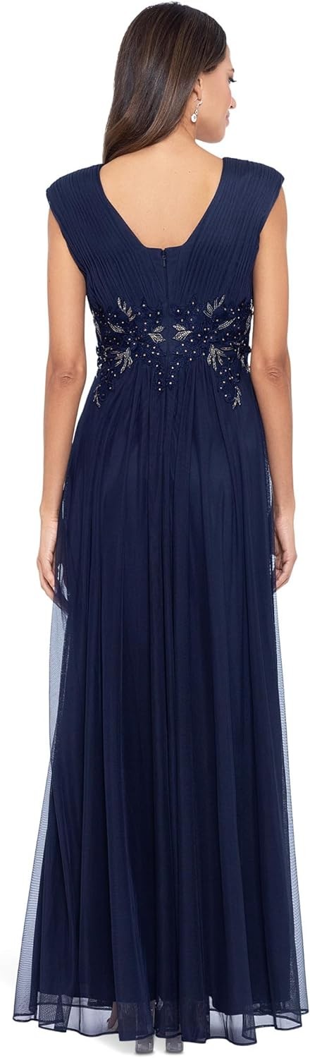 Betsy & Adam Long Chiffon Deep V Dress with Applique Navy/Navy/Gold 12