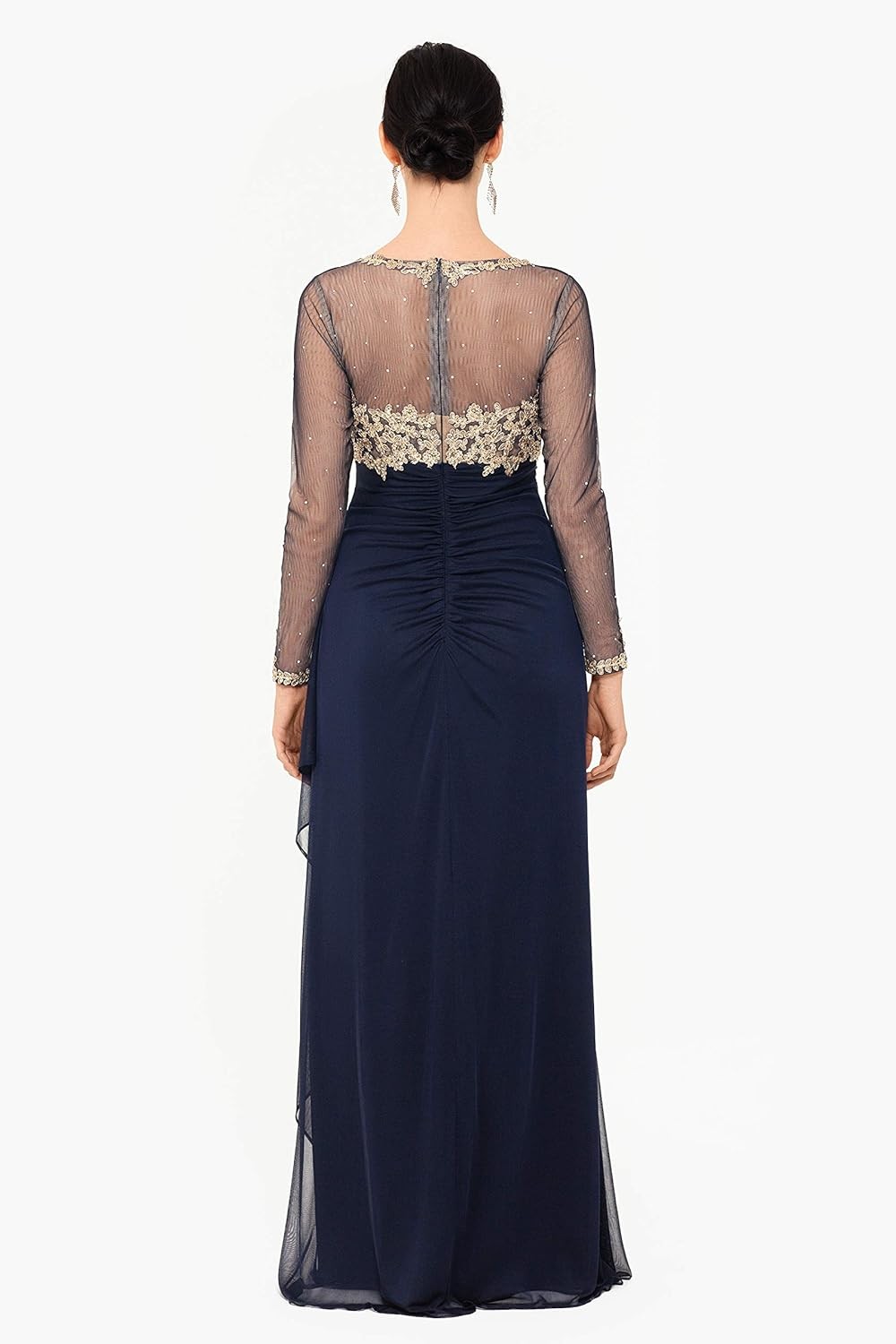 Long Sheer Mesh Sleeve Dress - Side Drape Illusion, Golden Lace Appliques Beads
