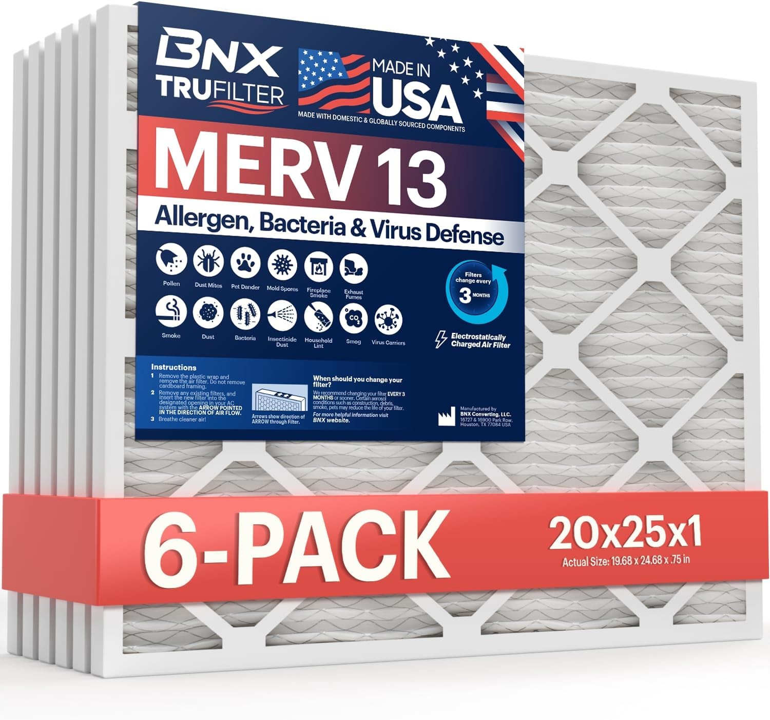 BNX TruFilter 20x25x1 Air Filter MERV 13 (6-Pack) - MADE IN USA - Electrostatic Pleated Air Conditioner HVAC AC Furnace Filters for Allergies, Pollen, Mold, Bacteria, Smoke, Allergen, MPR 1900 FPR 10
