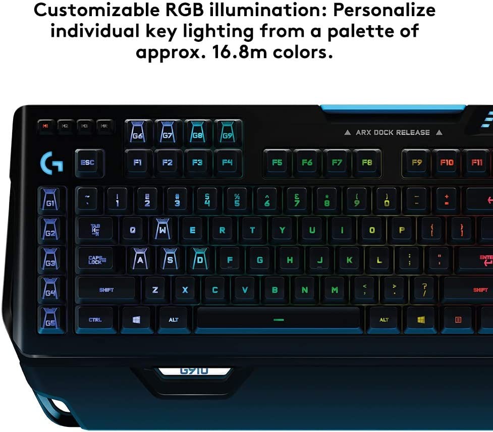 Exclusive Romer-G Mechanical Switches Exclusive Romer-G mechanical switches make Orion Spectrum our fastest keyboard ever. 1. 5mm actuation makes it possible for Orion Spectrum to receive input up to 25 percent faster than leading competitors, with 40 percent more durability at 70 million keystrokes..9 dedicated G-keys Intelligent RGB Illumination Customize Orion Spectrum’s RGB illumination from a palette of up to 16 million colors. Customize key illumination for specific games or game events. Each key top is entirely illuminated with 16MM color lighting for a beautiful, evenly lit glow. Arx Control Integration Smartphones and tablets can be connected to Orion Spectrum using the adjustable Smart Dock. Arx Control makes it possible for mobile devices to display in-game display information, vital system statistics and more. 9 Customizable G-keys Orion Spectrum’s 9 fully-customizable G-keys can be assigned commands per profile, and have been positioned for optimal speed and accessibility. Dedicated Media Controls Orion Spectrum’s dedicated media controls can be used to play, pause, and mute songs and videos. Use the on-board roller bar to adjust the volume, or skip scenes at the touch of a button.