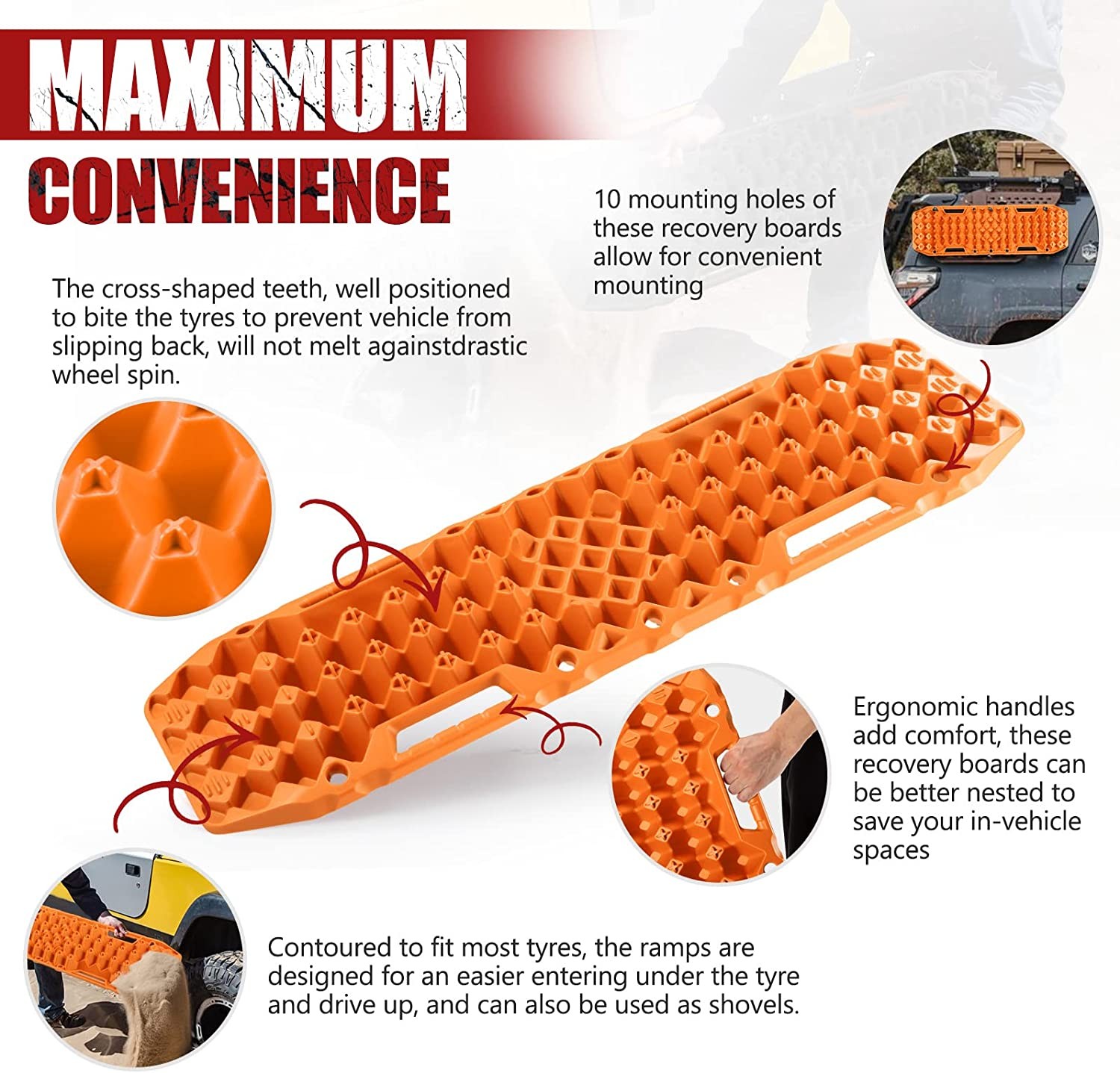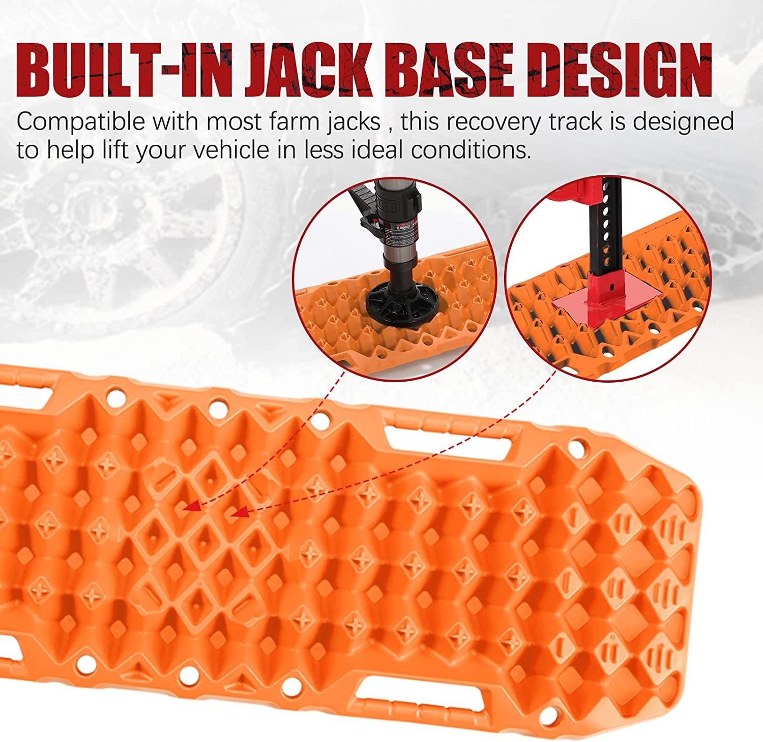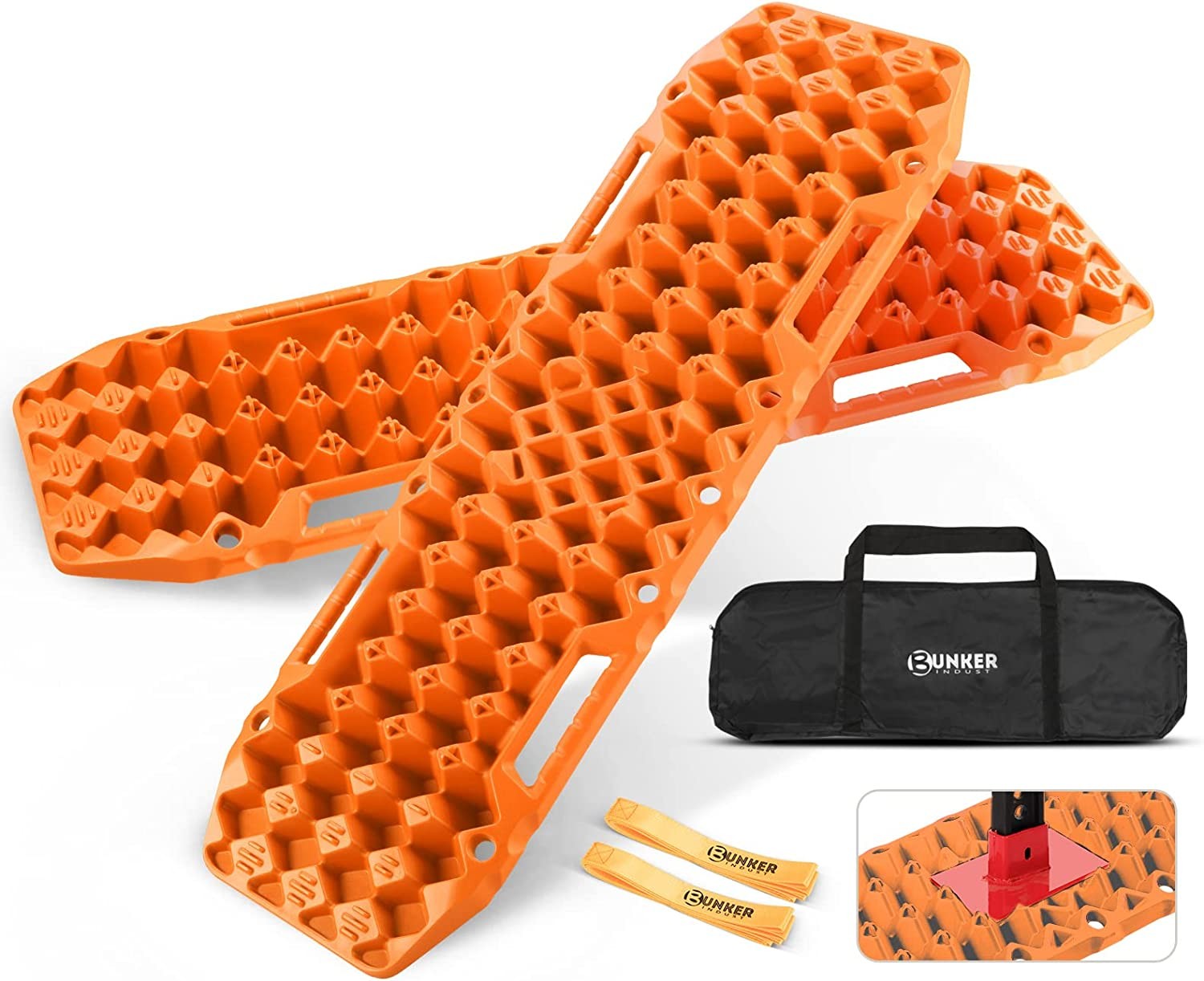 【JACK BASE FUNCTION】Designed with unique jack base in the center of the recovery traction mat is for emergency work, compatible with all jack to lift your 4x4. 【ULTRA FLEXIBILITY】 Both sides adopt the same diamond array construction, which means that the bottom has a firmer grip of the ground and can also be used to get vehicle unstuck, and that the traction boards can be bent to up to 120°without fracture. 【IMPROVED FORMULA】Take into consideration the extreme temperatures user will encounter in the wild, our recovery traction boards are able to work all year round between temperatures from -30°C (-22° F) to 60°C (140° F).Made of upgraded automotive grade polypropylene, flexible, lightweight, durable.Easy to clean, anti-corrosion, UV resistance, Ideal for off-road use. 【OPTIMIZED CONSTRUCTION】The cross-shaped teeth, well positioned to bite the tyres to prevent vehicle from slipping back, will not melt against drastic wheel spin, and contoured ramps are designed for an easier entering under the tyre and drive up. 【USER FRIENDLY DESIGN】Ergonomic handles add comfort when using its end as a shovel, 10 keyholes allow convenient mounting, and these traction tracks can be nested and better stacked to save your precious in-vehicle spaces. 【DOUBLE CAPABILITIES】The bottom of BUNKER recovery tracks adopts the same construction of the front to significantly increase friction and can also be used to get your vehicle unstuck. 【IDEAL RECOVERY TOOL FOR OFFROAD】These tire traction track (weighed 5.92kg per pair) can even withstand weight of up to 10 tons.Large size (40.4incn*12.9inch) of the traction mat is perfect for all vehicles.Simply place the traction mats under your vehicle's wheels, and help your car to get out of boggy mud, sand, ice, snow. 【BONUS】A sturdy carry bag serves as an added benefit, bring more convenient for daily use.Nylon leash makes it a breeze to retrieve your traction mats when the traction board is buried in the ground.