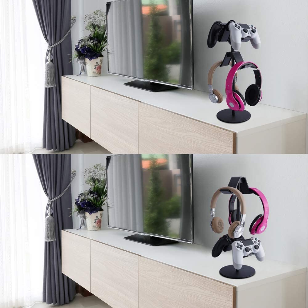 【Universal Dual Controller Holder】It can be placed up to 4 gamepads, which saves space very well, also can be placed 2 controller+2 headphones. You can put the game controller on the stand when charge, and you can also hang headset and other items 【Professional Design】This controller stand comes is made of high-quality metal&ABS, classical black, sturdy and cool, with a low center of gravity design, providing excellent stability without worrying about being hit. The bottom of the base is equipped with a silicone pad to prevent slippage and protect your desktop well 【Flexible & Adjustable】The position of the controller bracket can be adjusted to meet your various need, enhance the look of the controller, also an excellent way to display all your controllers.. A knob can be better lock the direction and provide excellent anti-slip performance 【Easy to Assemble】Our controller holder stand can be assembled easily, conveniently, and quickly without any other tools. You only need to push the holder into the base, and then connect the hanger to display your digital handle device, which is very simple and easy 【NO RISK PURCHASE】provides 24-hour reply and solution customer service, If you care about compatibility, style and quality, this controller stand is the best choice. It's also a great gift for your kids, gaming friends, boyfriends, etc