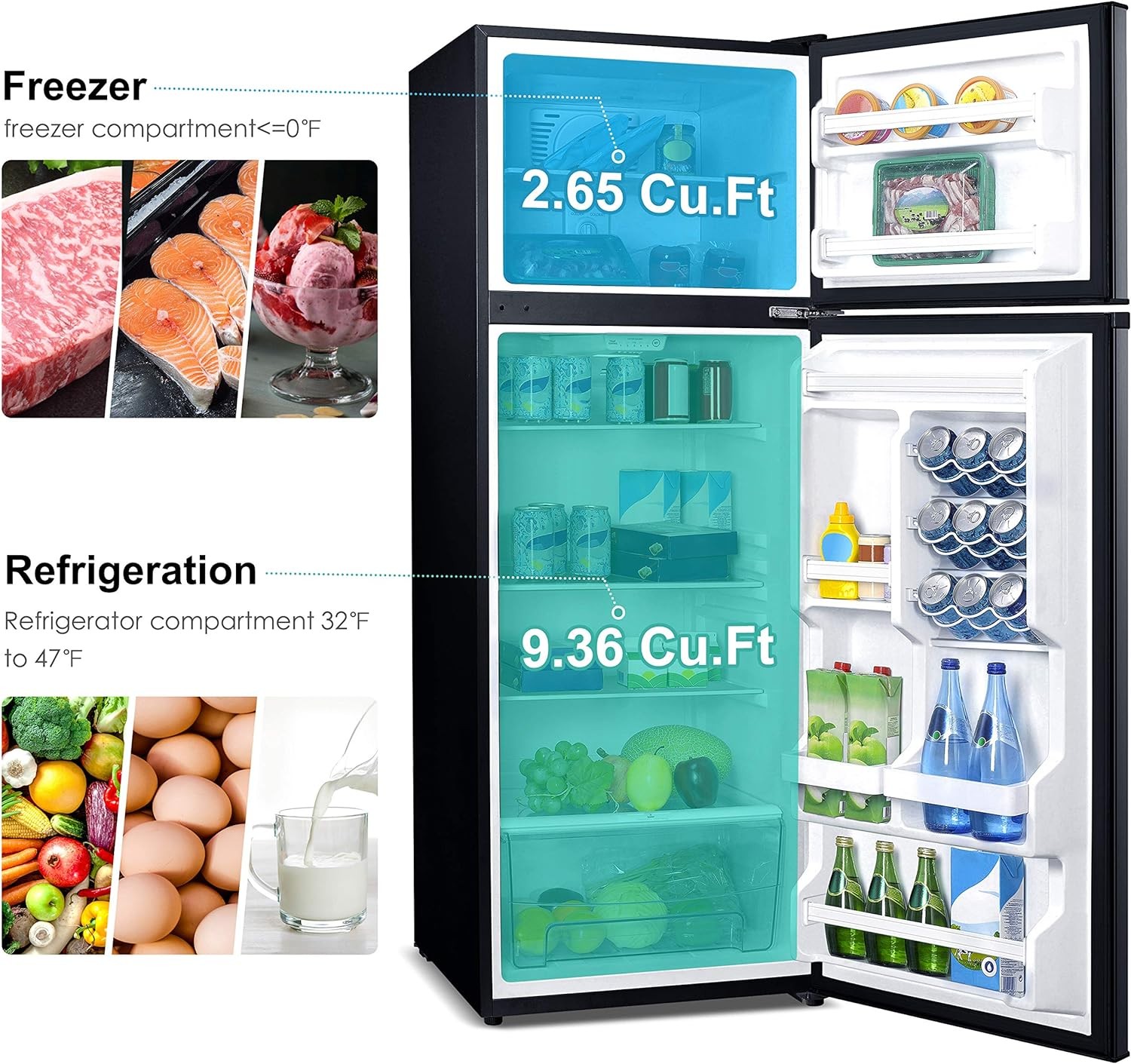 SPACE SAVING & LARGE CAPACITY: This top mount refrigerator with 23.58*27.68*64.84 inches measurement and 12.0 cubic feet capacity is perfectly sized to keep your favorite beverage cool, fruit or other food fresh, while taking up minimal space in your college dorm, RV, apartment, garage, camper or basement..Amperage : 1.2 amps REMOVABLE GLASS SHELVES: The glass shelf and drawer separate fruit and vegetable. Glass shelves can separate your different types of food. A removable slide-out glass shelf provides more ways to organize your storage needs. ENERGY SAVING & LOW NOISE: Top mount refrigerator uses R600a high-efficiency and low-energy consumption compressor, it can cool food quickly with lower energy. Energy efficient and Interior Light illuminates the interior. ADJUSTABLE ELECTRICAL: THERMOSTAT CONTROLThe thoughtful refrigerator offers an adjustable electrical thermostat to separate freezer compartment, bright LED interior lighting and vegetable crisper to make your life easily.