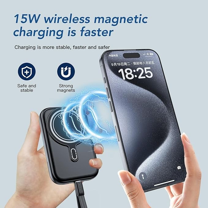 • Built-in PD 22.5 W USB C Cables Output: With type-C cord for Android compatible with Samsung S23, S22, S20, Note 20,Google Pixel, tablets. the wireless power bank provides versatile compatibility, delivering fast 22.5 W charging for your devices. Furthermore, embrace the convenience of wireless charging at speeds of up to 15 W