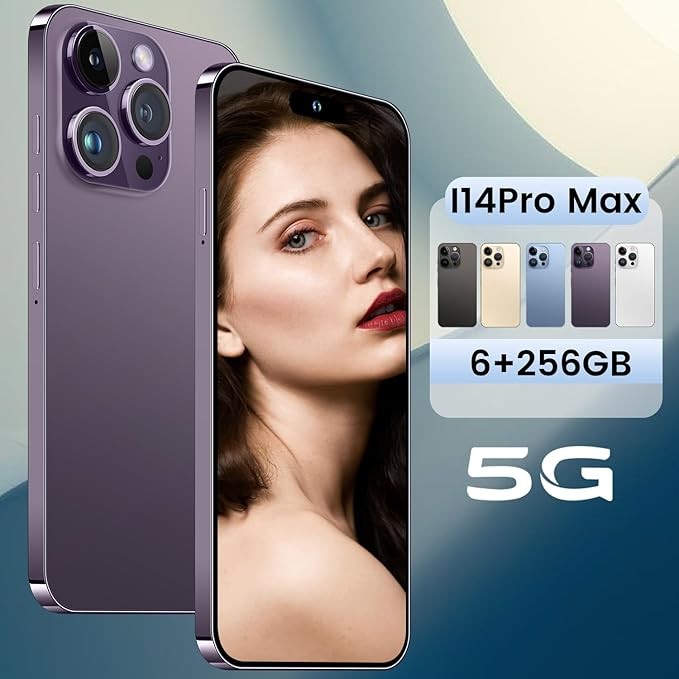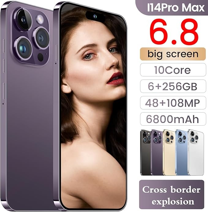 I14 Pro Max Unlocked Cell Phone,Long Battery Life 6.82" HD Screen Unlocked Phones,Android13 6+256GB Smartphone with 128G Memory Card,Dual SIM/Fingerprint Lock/Face ID/GPS (Purple)