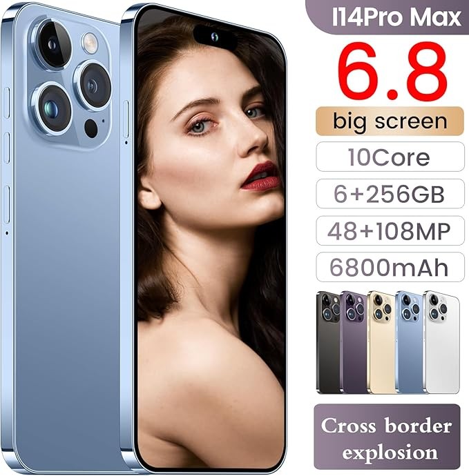 I14 Pro Max Unlocked Cell Phone,Long Battery Life 6.82" HD Screen Unlocked Phones,Android13 6+256GB Smartphone with 128G Memory Card,Dual SIM/Fingerprint Lock/Face ID/GPS(Blue)
