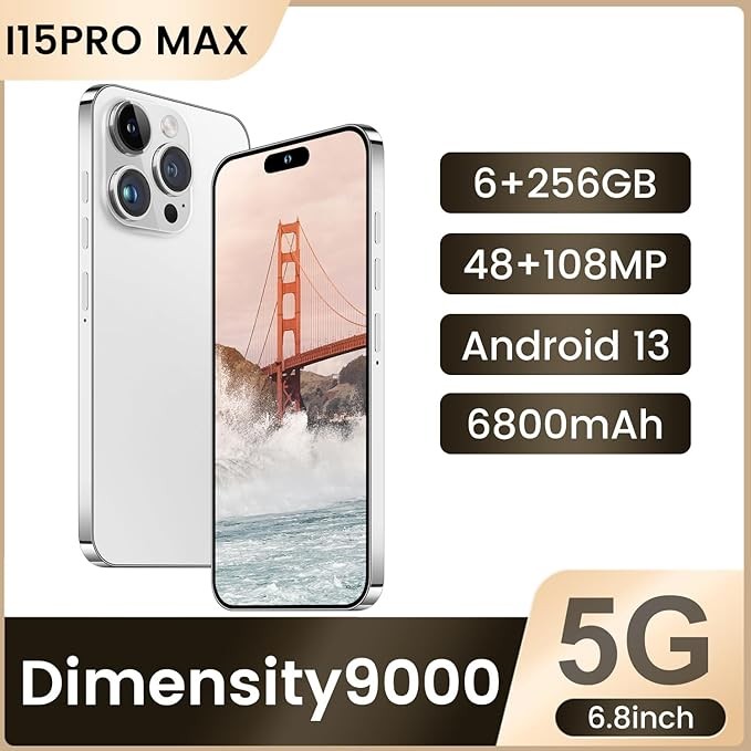 I15 Pro MAX Unlocked Phone,The Phone Battery 6800mAh 6.82" HD Screen Cell Phone, Android 13.0 6+256GB with 128GB Memory Card Smartphone,Face ID/Fingerprint Lock/5G/GPS (White)