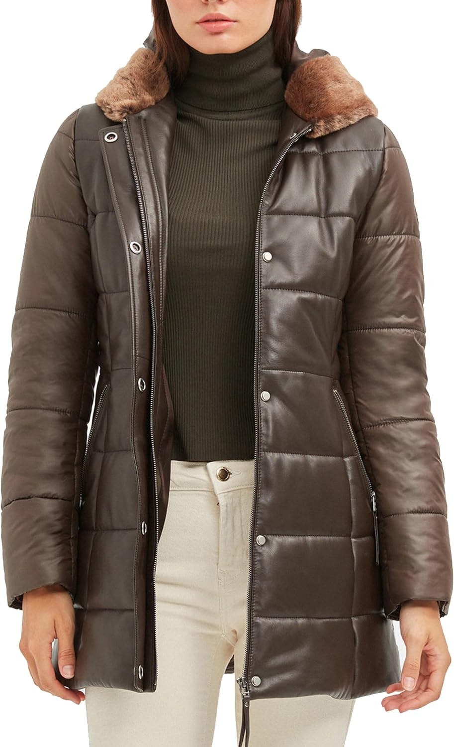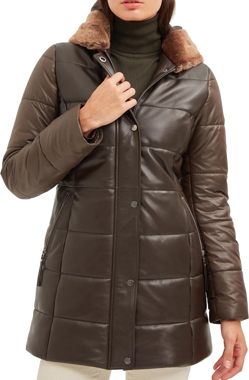 Women’s Shearling Hooded Puffer Coat – Lightweight Real Lambskin Leather Trench Coat