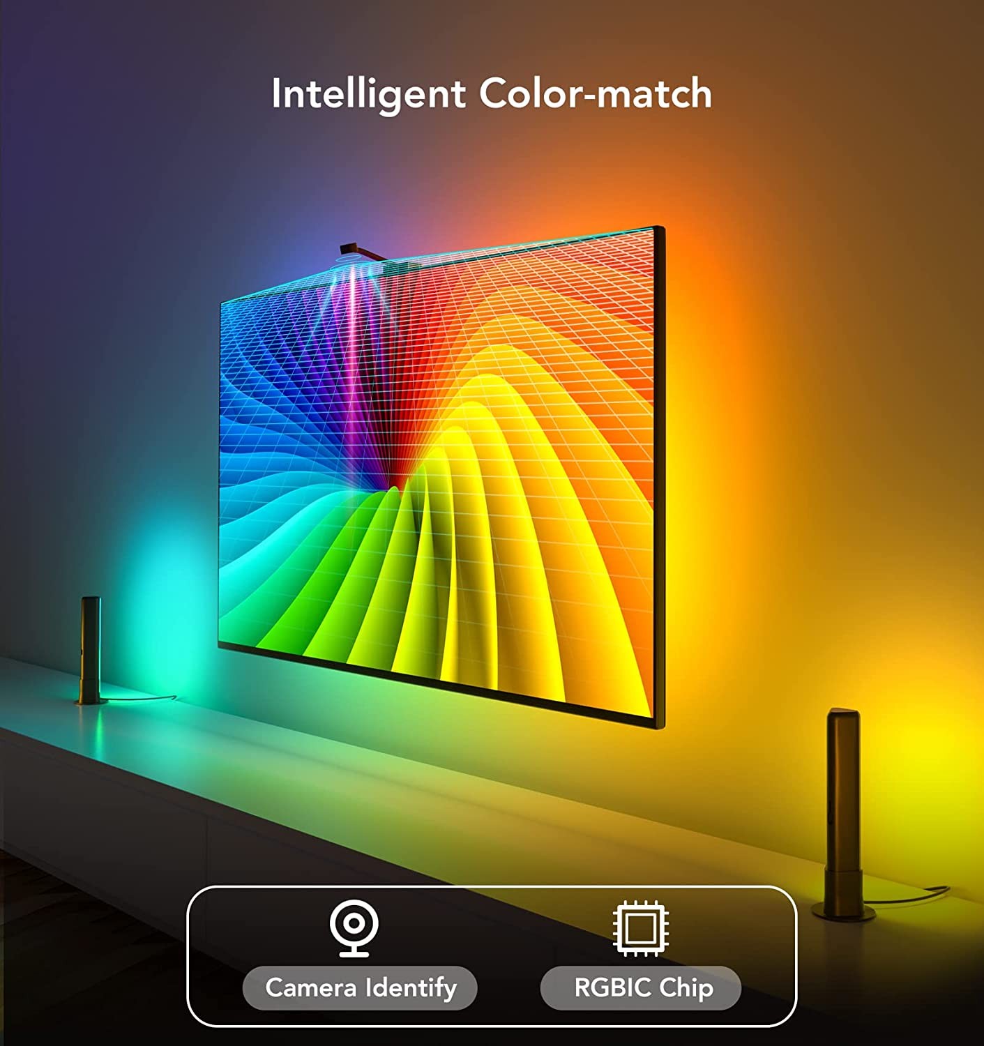 Govee Envisual Experience: This kit combines the LED TV backlights of our basic DreamView system with 2 smart light bars for even fuller reactive atmosphere lighting that takes any home theater or gaming setup to the next level. Intelligent Color-match Technology: With the 1080p Colorsense Camera, LED backlights, and 2 LED RGB light bars, our color changing smart atmosphere lights react with all your entertainment content in real time. Combined Video & Audio Syncing: This smart TV lighting system not only moves and changes brightness in sync with the visuals onscreen but it also syncs with the sounds from your favorite movies or video games, for DreamView that truly goes beyond. Energizing Multi-Color RGBIC Effects: Govee DreamView contains embedded independent control (IC) chips, which allow groups of LEDs to be individually controlled, allowing for a multiple colors to be simultaneously projected onto the walls behind. Smart Voice and App Control: Compatible with Alexa & Google Assistant for hands-free voice control of colors, modes, and effects. Experience in-depth Govee Home App smart features including DIY color & effects customization, light scheduling, and music modes.