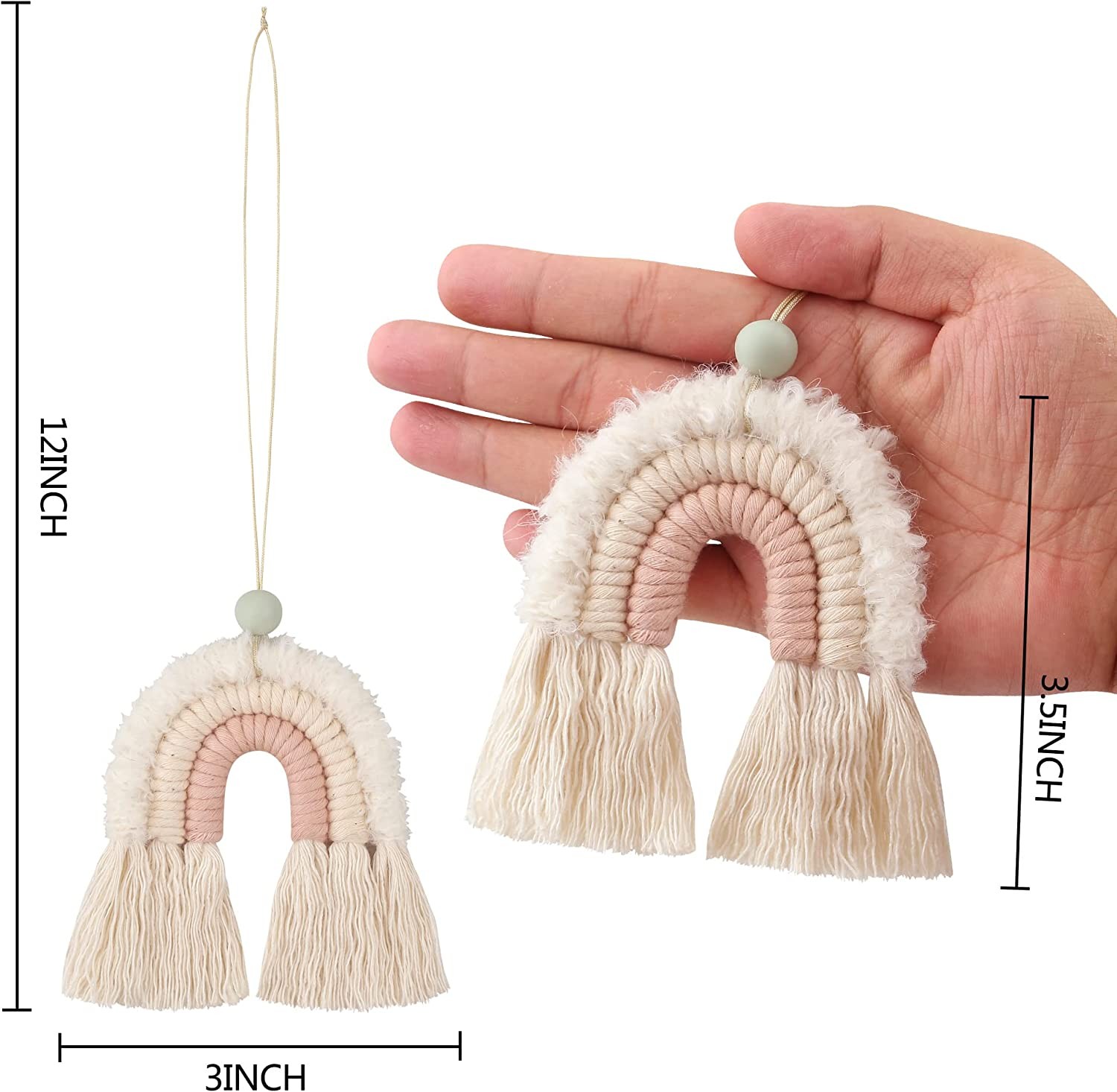 ? HANDMADE BY ARTISANS - These macrame boho decor rainbows are hand-sewn, assembled, and crafted by passionate artists. You will feel the love and quality. Promised. ? UNIQUE COLORS & PATTERNS - Express your creativity in every way possible. These hanging boho rainbow decor come in 10 different styles. Choose from natural and earthy to bright and colorful! ? A DELIGHTFUL SCENT - These boho decorations are more than just ornaments. You can sprinkle them with your choice of essential oils and they'll act as an air freshener for your car or room. ? DIY DECOR - These macrame rainbow accents are perfect for creating a cute string of ornaments. The rope for hanging is generously long so you can tie them together any which way you choose. ? QUALITY YOU CAN TRUST - Our hanging rainbow decor is made to last long. Our artists hand-sew each layer_no shortcuts through using glue. They're perfect if you want a piece that lasts.