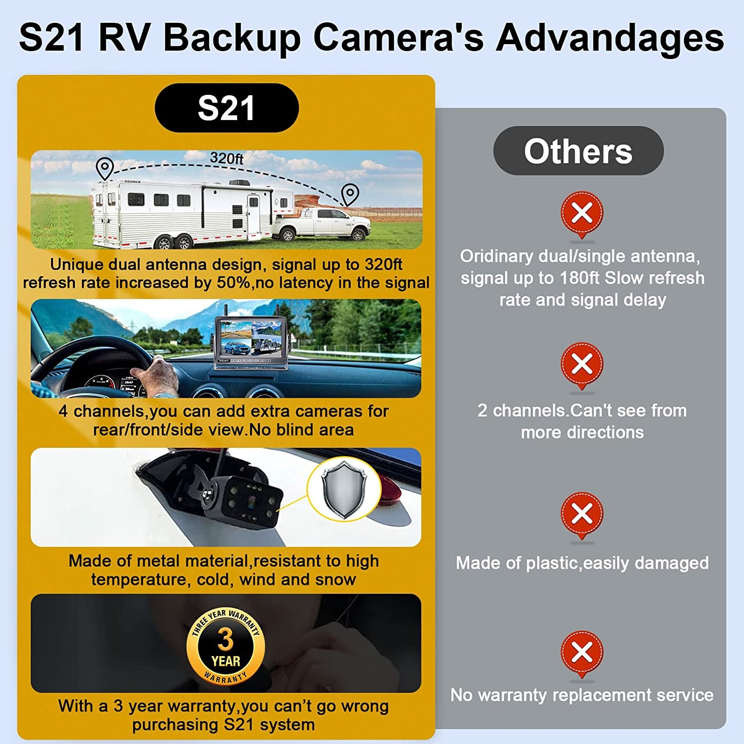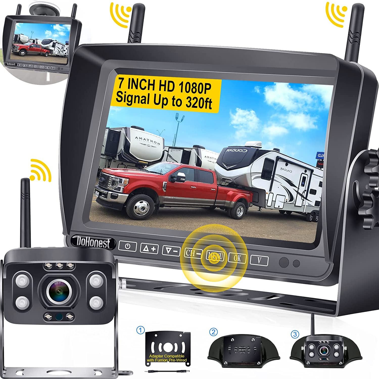 ►Upgraded wireless backup camera for RV – With unique dual antenna design and the latest digital signal chip, DoHonest wireless trailer camera can send HD 1080P videos to the display via the stronger signal. The signal can reach 500ft in open area and 320ft in vehicles. You don't worry signal interference and delay issues. ►Four way video inputs: – Wireless backup camera for truck has split screen ability with 4 way video Input CH1/CH2/CH3/CH4--,You can watch single image or split screen for dual view or quad view. ►Quick & simple setup –The transmitter is built into DoHonest backup camera with monitor.Just hook up the antennas and power them up, They will transport video signal automatically. With the latest sealing tech, the wireless rv backup camera with monitor is IP69 waterproof, also can withstand extreme temperatures from -4℉~149℉. No more lens water or fog problems. ►Super night vision – Outdated trailer backup camera wireless display video and images vaguely for they are just black and white combined while our upgrade wireless camper backup camera would be a major breakthrough, giving you an extraordinary visual experience with colorful images. You can still watch 60 feet vision even in a dark environment. ►Two years warranty – The reverse camera is compatible with RV/Pickup/Truck/Bus/Van/Trailer/Camper/5th wheel/Motorhome. Also, we provide extra adapter and pigtail cable for Furrion system via promotion. and we guarantee you will love our truck backup camera wireless system, that's beacuse our product support 24-Hour Online Customer Service, 30-day money-back guarantee, 36-month replacement warranty, and lifetime support.
