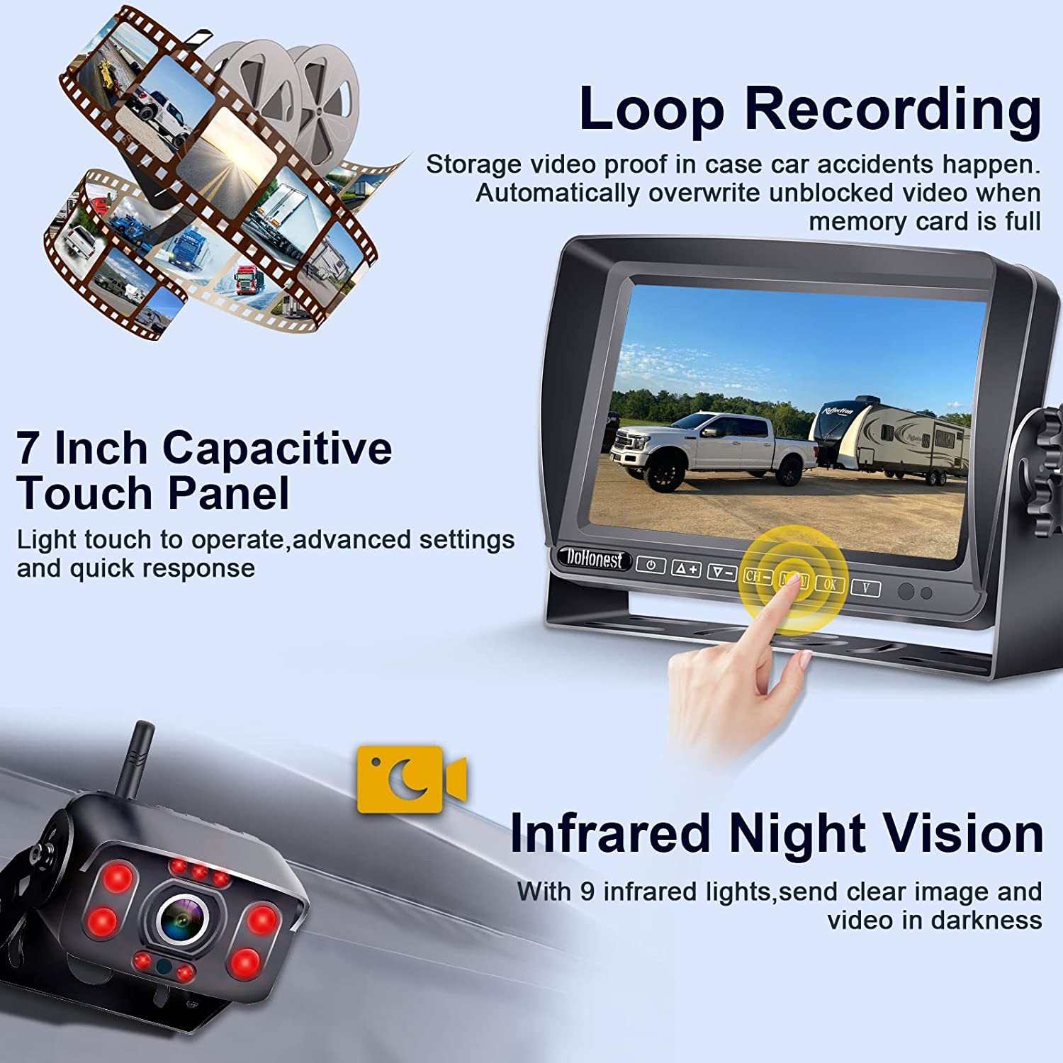 DoHonest RV Backup Camera Wireless HD 1080P with 7‘’ Touch Key DVR Monitor, 2022 Newest Version Rear View Camera Stable Signals Adapter for Furrion Pre-Wired for RVs,Truck,Trailer,IR Night Vision S21