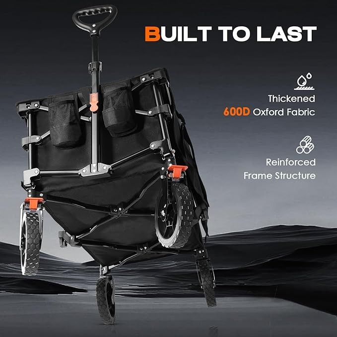 • 【Superior Material & Easy to Use】: Everyone would like to get a wagon featuring larger capacity, high quality and portability, our wagon could meet all your needs and be your best choice. The fabric material is made of 600D fabric and PVC coating to waterproof and durability. Unique frame structure design is for Sets up in seconds, no assembly required. The fold size is 21.7" x 11.4" x 8.7", which is easy to operate and transport.