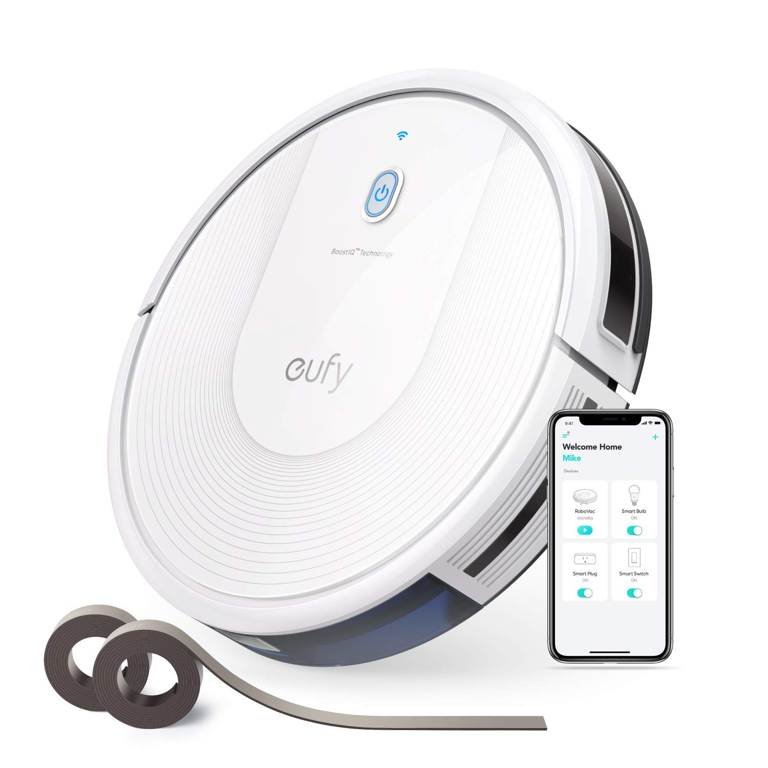 Wi-Fi Convenience: The eufy Clean app, and Amazon Alexa and the Google Assistant voice control-services let you accomplish your vacuuming needs with zero effort from you. Worry-Free Cleaning: Set Boundary Strips and the slim 2.85" body—upgraded to 1500Pa* suction—only cleans the areas you want. BoostIQ Technology: Automatically increases suction power within 1.5 seconds when extra vacuuming strength is needed—so you get the best clean. A Quiet Clean: Vacuums for up to 100 minutes** of constant, powerful suction at a volume no louder than an operating microwave. What You Get: RoboVac 30C, 13.2 ft Boundary Strips, remote control (2 AAA batteries included), charging base, AC power adapter, cleaning tool, extra set of high-performance filters, 4 side brushes, 5 cable ties, welcome guide, and our worry-free 12-month warranty.