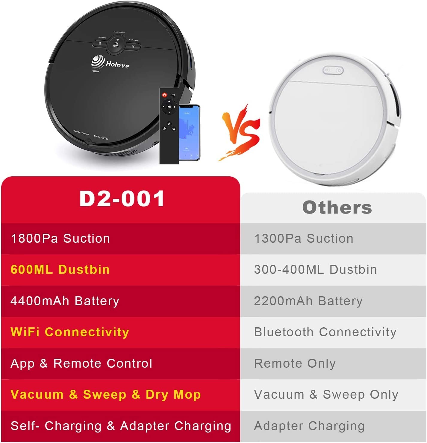 【SUPER BATTERY POWER & AUTOMATIC】High capacity 4400mAh battery, Offering long lasting cruising up to 90- 120 minutes, easily for big space cleaning requirement. Holove D2 rechargeable robot vacuum cleaner IR charging sensor can defect up to 8 meters from charging docking, Automatically go back to recharge when power is lower than 20 percent, after being fully recharged, auto continuing the unfinished cleaning task.